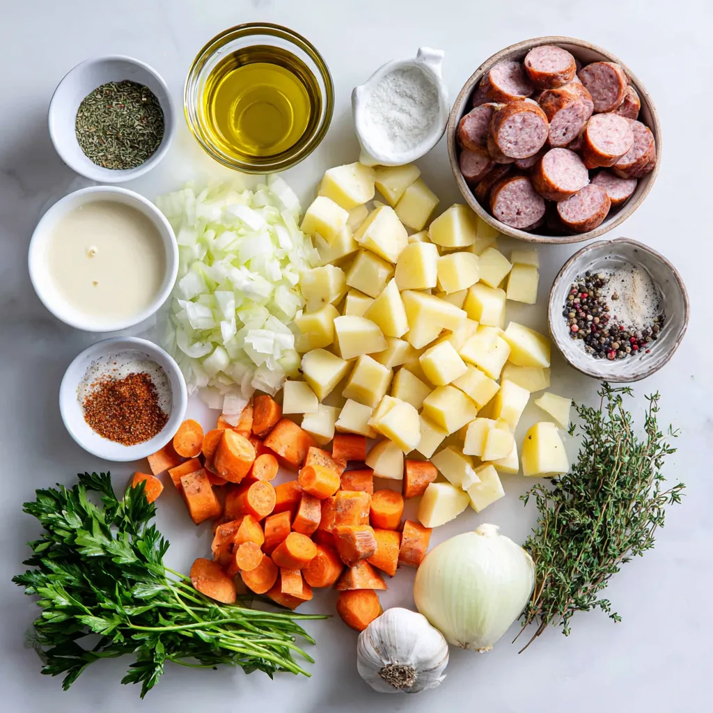 Kielbasa sausage is the star of this soup. Its smoky flavor gives the dish depth. I love how the sausage browns and adds richness to the broth. Next, we have potatoes and vegetables. Potatoes add heartiness, while carrots bring sweetness. They create a perfect base for the soup.