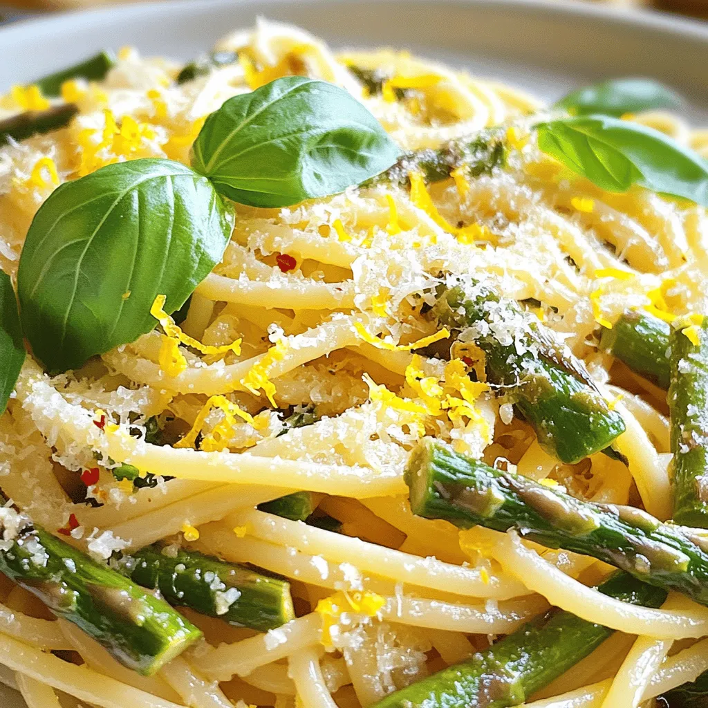 For this dish, I love using spaghetti or linguine. They hold sauce well and add a nice bite. Fresh asparagus gives this pasta a crisp texture and bright flavor. Garlic adds depth, while lemon brings a zesty kick that wakes up the taste buds. Extra-virgin olive oil ties everything together, adding richness.
