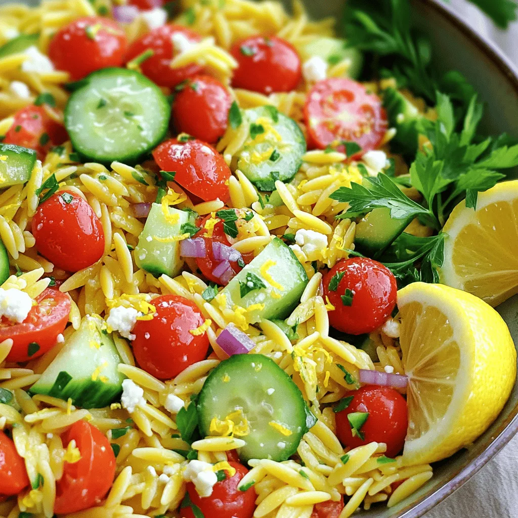 These ingredients bring fresh and bright flavors to your orzo salad. The garlic and lemon create a lovely base. The vegetables add crunch and color. Feta cheese gives a creamy, salty touch.