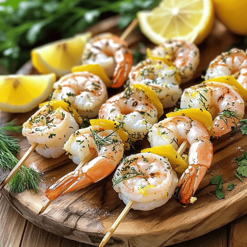 ![- 1 pound large shrimp, peeled and deveined - 3 tablespoons extra virgin olive oil - Zest of 1 medium-sized lemon - 2 tablespoons freshly squeezed lemon juice - 2 cloves garlic, finely minced - 1 tablespoon fresh parsley, finely chopped - 1 tablespoon fresh dill, finely chopped - 1 teaspoon smoked paprika - Salt and freshly ground black pepper, to taste - 8 wooden skewers (soaked in water for at least 30 minutes) Using fresh ingredients makes a big difference in taste. The shrimp brings a sweet flavor, while lemon adds brightness. Olive oil gives a smooth touch that ties it all together. Fresh herbs like parsley and dill add aroma and depth. Garlic gives a nice kick, enhancing the taste. When you prepare the skewers, ensure your shrimp are spread out. This helps them cook evenly. The smoked paprika adds a hint of warmth that makes every bite special. Salt and pepper are key for balancing flavors. Soaking the wooden skewers prevents them from burning on the grill. For the complete recipe, check out the [Full Recipe]. It guides you step by step to make this dish shine. Enjoy the process and get ready for a tasty meal! In a mixing bowl, combine the following ingredients for a tasty marinade: - 3 tablespoons extra virgin olive oil - Zest of 1 medium-sized lemon - 2 tablespoons freshly squeezed lemon juice - 2 cloves garlic, finely minced - 1 tablespoon fresh parsley, finely chopped - 1 tablespoon fresh dill, finely chopped - 1 teaspoon smoked paprika - Salt and freshly ground black pepper, to taste Whisk these together until they blend well. This mix adds great flavor to the shrimp. Now, add the shrimp to your marinade. Make sure each shrimp is coated in the mix. Cover the bowl and place it in the fridge for 20-30 minutes. This time helps the shrimp soak up all the tasty flavors. While the shrimp marinates, preheat your grill to medium-high heat. If you use a grill pan, heat it on the stovetop until hot. Next, take the soaked wooden skewers and carefully thread the marinated shrimp onto them. Aim for about 4-5 shrimp per skewer. Once ready, place the skewers on the grill. Grill the shrimp for 2-3 minutes on each side. They should turn a lovely pink color and become opaque when they are done. Keep an eye on them; overcooking can make them rubbery. After grilling, remove the skewers and let them rest for a few minutes. This helps the shrimp stay juicy. For the full recipe, be sure to check the detailed instructions. To get the best grilled shrimp, focus on the right cooking time and temperature. Preheat your grill to medium-high heat. This temperature is key for juicy shrimp. Cook the shrimp for 2-3 minutes on each side. They will turn pink and opaque when done. Avoid cooking them too long. Overcooked shrimp get tough and rubbery. Marinating shrimp is a great way to boost flavor. I suggest letting them soak for 20-30 minutes. This time helps the shrimp absorb the tasty herbs and lemon. For even more flavor, try adding a splash of hot sauce or a dash of cayenne pepper to the marinade. This small change can add a nice kick. Serve your Lemon Herb Grilled Shrimp with fresh sides. Grilled vegetables are a perfect match. Try zucchini, bell peppers, or asparagus. A crisp green salad also pairs well. Toss in some avocado or nuts for extra texture. You can also serve the shrimp over rice or quinoa for a filling meal. For a refreshing touch, add lemon wedges and a sprinkle of herbs when serving. {{image_4}} You can change the herbs in this recipe. Instead of parsley and dill, try basil or cilantro. Each herb brings a new taste. Basil gives a sweet flavor, while cilantro adds a fresh one. You can mix and match to find your favorite. Experimenting with herbs makes the dish fun and unique. Don't have a grill? No problem! You can cook shrimp in the oven or on the stovetop. For oven broiling, preheat your broiler. Place the skewers on a baking sheet and broil for about 2-3 minutes per side. If using a stovetop grill pan, heat it over medium-high heat. Cook the shrimp as you would on an outdoor grill. Both methods will give you tasty results. Want to make this dish gluten-free? Simply check your smoked paprika for gluten. It's usually safe, but some brands may add gluten. For a low-carb option, skip any bread sides. Serve the shrimp with fresh veggies or a salad instead. This keeps your meal light and healthy. To keep leftover grilled shrimp fresh, place them in an airtight container. Make sure to cool them down first. Refrigerate them within two hours of cooking. Properly stored, they last for up to three days. If you want to enjoy them later, don’t forget to label the container. When it's time to reheat, don’t use the microwave if you can avoid it. Instead, heat a skillet over medium heat. Add a bit of olive oil to keep shrimp moist. Cook for about 2-3 minutes until warm. You can also reheat them on the grill for extra flavor. Just watch closely so they don’t overcook and become rubbery. Freezing grilled shrimp is a great way to save them for later. First, let them cool completely. Then, place them in a freezer-safe bag. Try to remove as much air as possible to prevent freezer burn. These shrimp can last for up to three months in the freezer. When you’re ready to eat, thaw them in the fridge overnight or use cold water for a quicker method. Shrimp cook quickly. Look for a bright pink color and opaque flesh. The shrimp should curl into a "C" shape. If they curl tightly into an "O," they may be overcooked. To avoid this, cook shrimp for just 2-3 minutes per side on a hot grill. Always check a few pieces to ensure even cooking. Yes, you can use frozen shrimp! Just remember to thaw them first. The best way is to place them in the fridge overnight. If you're in a hurry, run them under cold water for about 10-15 minutes. Once thawed, pat them dry with a paper towel. This helps the marinade stick better. You can use many herbs! Here are some great options: - Basil - Cilantro - Chives - Thyme - Oregano - 