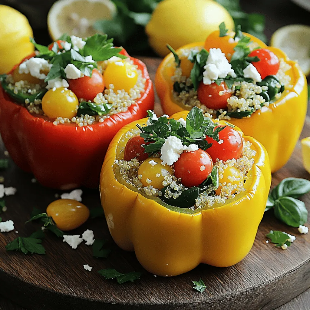 - 4 large bell peppers - 1 cup quinoa - 2 cups vegetable broth or water - 1 cup cherry tomatoes - 1 cup fresh spinach - 1/4 cup fresh parsley - 1/4 cup fresh basil - 1/4 cup feta cheese (optional) - 1 lemon (juice and zest) - 2 cloves garlic - 1 teaspoon extra virgin olive oil - Salt and pepper To make Lemon Herb Quinoa Stuffed Peppers, gather the following ingredients. Start with four large bell peppers. You can pick any color you like. Next, you need one cup of quinoa. Rinse it well before using. This keeps your dish light and fluffy. You will also need two cups of vegetable broth or water for cooking the quinoa. For a burst of flavor, grab one cup of halved cherry tomatoes. Fresh spinach adds great texture, so use one cup of coarsely chopped leaves. Herbs are key for this dish. Use a quarter cup each of finely chopped parsley and basil. For a creamy touch, add a quarter cup of crumbled feta cheese, but this is optional. Don’t forget one lemon! You will need both its juice and zest. Two cloves of minced garlic enhance the taste. Finally, grab a teaspoon of extra virgin olive oil, along with salt and pepper to season. These fresh ingredients create a delightful mix of flavors in each stuffed pepper. Each bite will offer a tasty experience, combining the zest of lemon, the warmth of herbs, and the heartiness of quinoa. Enjoy the process of preparing this meal—it’s as much fun as it is rewarding! - Preheat your oven to 375°F (190°C). - Take the bell peppers and slice the tops off. Remove the seeds inside. Place the peppers upright in a baking dish. This keeps them stable as they cook. - In a medium saucepan, mix the rinsed quinoa with vegetable broth. - Bring this mixture to a boil. Once it boils, lower the heat. Cover it and let it simmer for about 15 minutes. The quinoa should be fluffy and all the broth absorbed. - In a large bowl, combine the cooked quinoa with cherry tomatoes, spinach, parsley, basil, lemon juice, lemon zest, and minced garlic. - Stir until all ingredients mix well. Season to taste with salt and pepper. - If you like feta cheese, fold it gently into the quinoa mix. Make sure it’s spread evenly without breaking it too much. - Take each bell pepper and fill it with the quinoa mixture. Pack it in tightly. This helps the peppers keep their shape while baking. - Cover the baking dish with aluminum foil. This traps moisture while baking. - Bake in the preheated oven for 25 minutes. After that, remove the foil and bake for another 10 minutes. The peppers should be soft and slightly caramelized. To make the best quinoa, start by rinsing it well. Rinsing removes the bitter coating called saponin. After rinsing, cook the quinoa in vegetable broth instead of water. This adds a rich flavor that makes the dish stand out. You can boost the taste of your dish by adding fresh herbs. I suggest using parsley and basil for a fresh touch. You might also try oregano or thyme for a different flavor. Remember to season the quinoa mixture with salt and pepper. Taste as you go to get it just right! For a complete meal, pair your stuffed peppers with a green salad. A light vinaigrette will complement the flavors nicely. You can also serve them with a side of roasted veggies or a creamy yogurt dip. These sides enhance the meal and make it more filling. {{image_4}} You can use many types of peppers in this recipe. Large bell peppers are great, but mini peppers make fun appetizers. They are easy to eat and look pretty on a plate. You can also mix colors. Green, red, yellow, and orange peppers add beauty to your meal. The colors pop and make your dish more inviting. If you want a dairy-free version, skip the feta cheese. The quinoa and veggies still taste great. You can add extra vegetables or legumes. Try black beans or corn for added texture. This keeps the meal filling and healthy. You can also add a splash of lime juice for extra zest. Quinoa is not your only choice. You can swap it for rice or couscous. Both options work well and can change the flavor. If you want more protein, include beans. Chickpeas or lentils are also tasty additions. They blend well with the herbs and spices. This gives you a hearty meal that everyone will enjoy. To keep your lemon herb quinoa stuffed peppers fresh, first let them cool. Place them in an airtight container. This way, they stay moist and tasty. Store the container in the refrigerator. These peppers last for about 3 to 4 days. If you want to keep them longer, freezing is a great option. Wrap each pepper in plastic wrap, then place them in a freezer bag. Remove as much air as possible. They can stay in the freezer for up to 3 months. When it’s time to enjoy your stuffed peppers again, reheating is simple. You can use the oven or the microwave. For the oven, preheat it to 350°F (175°C). Place the peppers on a baking dish. Cover them with foil to keep them moist. Heat for about 15 to 20 minutes. If you use the microwave, place one pepper on a plate and cover it with a damp paper towel. Heat for 2 to 3 minutes. This keeps the flavor and texture just right. Enjoy your meal as if it was freshly made! Stuffed peppers can last in the fridge for about 3 to 5 days. Store them in an airtight container. Make sure they cool completely before placing them in the fridge. This helps avoid moisture build-up, which can make them soggy. Yes, you can make stuffed peppers ahead of time. Prepare them and store them unbaked in the fridge for up to 24 hours. When you're ready to bake, just pop them in the oven. You may need to add a few extra minutes to the baking time since they will start cold. Great sides for stuffed peppers include: - A simple green salad - Steamed broccoli or green beans - A side of roasted sweet potatoes These sides add color and nutrition to your meal and help balance flavors. Peppers are done when they are soft and slightly caramelized. You can test them by piercing with a fork. If it goes in easily, they are ready. The filling should also b