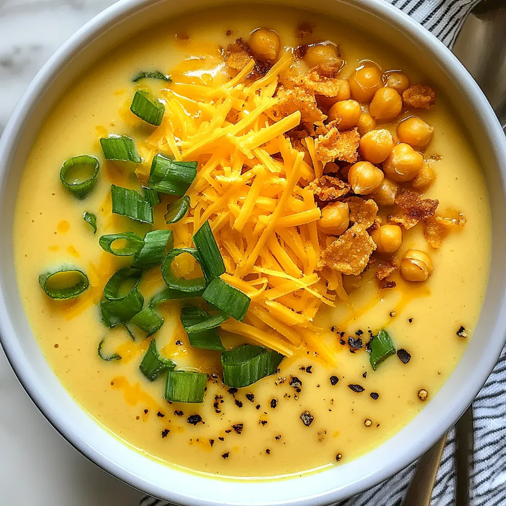 - Serve the soup hot, garnished with a sprinkle of extra shredded cheese, fresh sliced green onions, and optional toppings like crispy chickpeas or bacon bits for a delightful crunch.