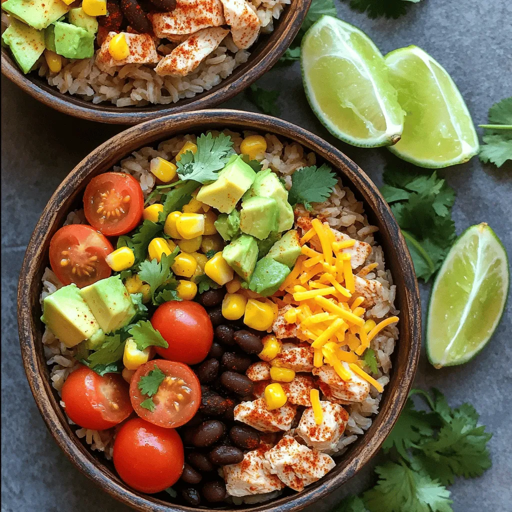 ![- 2 cups cooked brown rice - 1 lb boneless, skinless chicken breast, diced - 1 can (15 oz) black beans, rinsed and drained - 1 cup corn (fresh, frozen, or canned) - 1 ripe avocado, diced - 1/2 cup shredded cheddar cheese - 1 tablespoon taco seasoning - Salt and black pepper to taste - Optional toppings: sour cream, salsa, sliced jalapeños For these Loaded Chicken Burrito Bowls, I focus on simple, fresh ingredients. The brown rice serves as a wholesome base. It adds fiber and nutrients. I choose boneless, skinless chicken breast for lean protein. It cooks up juicy and tender. Black beans bring extra protein and a creamy texture. Rinsing them helps remove excess sodium, making them healthier. Corn adds sweetness and a pop of color. You can use fresh, frozen, or canned, based on your preference. Avocado is a delightful addition. It brings creaminess and healthy fats. The shredded cheddar cheese adds richness and flavor. For seasoning, I use taco seasoning. It gives a bold taste without extra effort. I also add salt and black pepper to enhance the flavors. Toppings are where you can get creative. I suggest sour cream for creaminess. Salsa adds zest, and sliced jalapeños bring heat. Feel free to mix and match as you like. You can find the Full Recipe for all these delicious ingredients and how to prepare them. - Heat olive oil in a skillet over medium heat. - Add diced chicken and season with taco seasoning. First, I heat a tablespoon of olive oil in a skillet over medium heat. I want the oil to shimmer before adding the chicken. Once it’s hot, I toss in the diced chicken breast. I sprinkle it with taco seasoning, along with a pinch of salt and black pepper. I cook this for about 6 to 8 minutes. I stir often to ensure even cooking. The chicken should turn a lovely golden brown and reach an internal temperature of 165°F. - Prepare brown rice according to package instructions. - Fluff rice once cooked. While the chicken cooks, I prepare brown rice. I follow the package instructions closely. This step is key for fluffy rice. Once it’s cooked, I use a fork to fluff the rice. Fluffy rice makes a great base for my burrito bowls. - Mix black beans, corn, and tomatoes in a bowl. - Combine with cooked chicken and layer on rice. Next, I grab a large mixing bowl. I combine the rinsed black beans, corn, and halved cherry tomatoes. I gently toss them together until they mix well. Once the chicken is done, I add it to the bowl. I stir everything together to let the flavors blend. Now it's time to build the burrito bowls! I divide the fluffy brown rice into four serving bowls. I spoon the chicken mixture on top of the rice in each bowl. Next, I add diced avocado, shredded cheese, and fresh cilantro. For a zesty finish, I serve lime wedges on the side. You can also add sour cream or salsa if you want. For the full recipe, check the complete instructions and ingredient list. Enjoy making your loaded chicken burrito bowls! How to ensure chicken is cooked thoroughly To cook chicken safely, use a meat thermometer. The internal temperature should reach 165°F. Cook chicken pieces until they are golden brown and no longer pink inside. This ensures it is juicy and safe to eat. Best practices for fluffy rice For fluffy rice, rinse it well before cooking. This removes extra starch that makes it sticky. Cook it with the right water ratio, usually 2 cups of water for every cup of rice. After cooking, fluff it gently with a fork. This keeps the grains separate and light. Colorful arrangement ideas for the toppings To make your burrito bowls pop, layer the toppings by color. Place bright tomatoes, vibrant corn, and green avocado on top. This adds visual interest. You can also create small sections on the bowl for each topping. This way, each bite looks and tastes amazing. Using garnishes to enhance visual appeal Fresh herbs like cilantro can elevate your dish. Sprinkle them on top for a burst of color. Lime wedges can add a zesty touch. Place them artfully around the bowl for that extra flair. Suggestions for extra spices or ingredients to add To boost the flavor, try adding cumin or smoked paprika. These spices add warmth and depth. You can also mix in jalapeños for heat or lime juice for brightness. Freshly chopped garlic can also add a punch of flavor. Alternative cooking methods for chicken If you want to switch it up, grill or bake the chicken instead of pan-frying. Grilling adds a nice smoky flavor. Baking can keep it tender and juicy. You can marinate the chicken beforehand to infuse even more flavor. For the Full Recipe, check the earlier section for all the details! {{image_4}} You can easily make Loaded Chicken Burrito Bowls vegetarian or vegan. To do this, simply replace the chicken with a plant-based protein. Options include lentils, tempeh, or tofu. For a vegan cheese option, try cashew cheese or nutritional yeast. For gluten-free options, make sure to check your taco seasoning. Some brands add gluten. You can also swap brown rice for quinoa or cauliflower rice. If you like heat, add jalapeños or hot sauce to your bowl. This gives a spicy kick that enhances the flavors. You can also try different beans like pinto or kidney beans. Each type adds a unique taste and texture to your dish. Feel free to adjust your ingredients based on what is in season or what you like best. You can swap corn for bell peppers or zucchini for a fresh twist. For cheese, consider using feta or goat cheese for a different flavor. If you want a creamy topping, try Greek yogurt instead of sour cream. These swaps keep your bowls exciting! For the full recipe, check out the complete details in the recipe section. To keep your loaded chicken burrito bowls fresh, store them in airtight containers. This helps preserve flavor and texture. Place all components in separate containers if possible. This way, the rice, chicken, and toppings stay fresh longer. Generally, leftovers last about 3 to 4 days in the fridge. Make sure to check