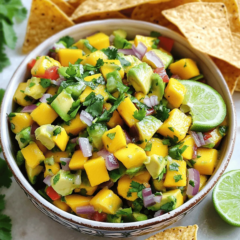 ![- 1 ripe mango, diced - 2 ripe avocados, diced - 1 small red onion, finely chopped - 1 sweet red bell pepper, diced - 1 jalapeño, minced - 1/4 cup fresh cilantro, chopped - Juice of 2 limes - 1 tablespoon extra virgin olive oil - Salt and black pepper to taste How to choose the perfect mango Look for a mango that feels slightly soft when you press it. The skin should have a nice golden hue. A ripe mango smells sweet at the stem end. Choosing the best avocados Pick avocados that yield to gentle pressure. The skin should be dark green or black, depending on the variety. Avoid hard or overly mushy avocados. Signs of a fresh jalapeño A fresh jalapeño should be firm and glossy. Look for bright green skin without wrinkles. A fresh pepper has a crisp feel and a spicy aroma. These tips will help you find the best ingredients for your salsa. Fresh produce makes your dish more vibrant and tasty. For the full recipe, check the details above. - Start by washing all your fresh produce. - Dice the ripe mango into small cubes. - Carefully cut the avocados into bite-sized pieces. - Finely chop the red onion for sharp flavor. - Dice the red bell pepper for sweetness. - Mince the jalapeño, adjusting to your heat preference. Next, in a large mixing bowl, combine the diced mango, avocado, chopped onion, red bell pepper, and minced jalapeño. Gently fold in the chopped cilantro, spreading the fresh herb throughout. Squeeze the juice of two fresh limes over the mix, along with a tablespoon of olive oil. This adds richness. Use a spatula to carefully toss the ingredients. Keep the avocado pieces intact to maintain texture. Season the salsa with salt and freshly cracked black pepper, mixing lightly to combine. Resting time is key for great flavor. Let the salsa sit for about 10 minutes at room temperature. This duration allows the ingredients to blend and the flavors to develop. When you let the salsa rest, the lime juice and olive oil soak in. This process enhances the taste and makes every bite burst with flavor. Enjoy this fresh, vibrant dish as a wonderful side or topping. For the full recipe, check out the details above. - How to keep avocados from browning: To stop avocados from turning brown, use lime juice. The acid in lime juice slows oxidation. Squeeze fresh lime juice right after cutting the avocado. Mix it in well to cover all the flesh. You can also store the salsa in an airtight container to keep it fresh longer. - Using lime juice effectively: Lime juice brightens the flavors in your salsa. Use freshly squeezed lime juice rather than bottled juice. It tastes better and adds a nice zing. Aim for about two limes for this recipe. Adjust based on your taste! - Importance of ingredient proportions: Balance is key to great salsa. Use equal parts of mango and avocado for a good mix. Too much onion can overpower the other flavors. Keep the jalapeño mild if you prefer less heat. Taste as you go, and adjust the ingredients to suit your own palate. - Pairing with tortilla chips: Serve your mango avocado salsa with crispy tortilla chips. The crunch of the chips pairs well with the smoothness of the salsa. It makes for a perfect snack or appetizer at parties. - Using as a topping for grilled meats: This salsa works great as a topping for grilled chicken or fish. The sweet and spicy flavors complement the meat beautifully. Just spoon it on right before serving for the best taste. - Incorporating into tacos or burritos: Use this salsa to add freshness to tacos or burritos. It enhances your meal with vibrant flavors. Just add a scoop in your taco or wrap it up in a burrito, and enjoy! For the full recipe, check out the complete method to create this delicious dish. {{image_4}} You can make mango avocado salsa even better with new flavors. Try adding tropical fruits like pineapple or papaya. These fruits bring a sweet twist and a fun texture. You can also mix in fresh herbs like mint or basil. These herbs give a fresh taste that brightens the salsa. Want more heat? You can swap out the jalapeño for a serrano or habanero pepper. These peppers can make your salsa spicy and exciting. Just remember to taste as you go! Making mango avocado salsa fit your diet is easy. If you're vegan, this recipe is already perfect. It has no animal products and is full of healthy fats. If you need a low-sodium option, skip the added salt. The fresh lime juice and other ingredients give plenty of flavor. For those with allergies, check each ingredient. You can always swap out foods that cause issues for you. This salsa is a versatile dish that everyone can enjoy. Try these ideas to make it your own! For the full recipe, check out the [Full Recipe]. To keep your mango avocado salsa fresh, put it in the fridge. Use an airtight container. This helps prevent the salsa from browning. The salsa stays good for about 2 to 3 days in the fridge. If you see browning, it’s best to toss it. Yes, you can freeze mango avocado salsa! However, know that the texture might change. For best results, freeze it without the avocado. This keeps the salsa tasting fresh. When you're ready to use it, transfer it to the fridge for a slow thaw. To freeze, use a freezer-safe container. Leave some space at the top for expansion. You can also use freezer bags. Squeeze out the air before sealing. When thawing, avoid using a microwave. This can make the salsa mushy. Instead, let it sit in the fridge overnight. Once thawed, mix it well before serving. If it seems dry, add a splash of lime juice for extra flavor. Enjoy your mango avocado salsa fresh and flavorful! How long does mango avocado salsa last? Mango avocado salsa lasts about 2 to 3 days in the fridge. To keep it fresh, store it in an airtight container. The avocado may brown, but it will still taste good. Can I make salsa ahead of time? You can make salsa ahead of time. Just prepare it a few hours before serving. This allows the flavors to mix well. If you make it too early, the avocado may brown. Wh