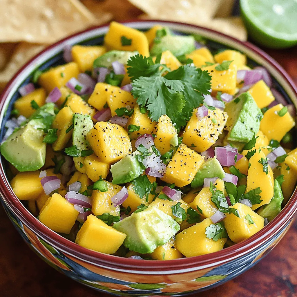 ![- 1 ripe mango, diced into small cubes - 2 ripe avocados, diced into small cubes - 1 small red onion, finely chopped - 1 jalapeño, minced - 1/4 cup fresh cilantro, finely chopped - Juice of 2 limes - Salt and pepper to taste - Optional: 1/2 teaspoon ground cumin To create a vibrant mango avocado salsa, you need fresh, tasty ingredients. First, pick a ripe mango. A ripe mango should feel slightly soft when you press it. Next, choose ripe avocados. They should also yield slightly to gentle pressure. The red onion adds a nice crunch and color. Finely chop it for the best texture. The jalapeño brings the heat. If you want less spice, remove the seeds. Fresh cilantro adds a bright flavor. Always choose fresh herbs for the best taste. Lime juice helps balance the sweetness of the fruits. It also keeps the avocados from browning. Salt and pepper enhance all the flavors. If you like a warm taste, add ground cumin. You can switch things up based on your taste. Try different types of onions, like white or green. They each bring a unique flavor. You can also add black beans or corn for extra texture and nutrition. If you love spice, add more jalapeño or try other peppers. Each choice lets you make this salsa your own. Explore and enjoy the creative process. Check out the Full Recipe for more details! - Start with a ripe mango. Cut it into small cubes. Place the mango in a large mixing bowl. - Next, take two ripe avocados. Dice them into small cubes, too. Add them gently to the bowl. - Now, grab a small red onion. Finely chop it and mix it into the bowl. - For some heat, use a jalapeño. Deseed it and mince it based on your spice level. - Chop 1/4 cup of fresh cilantro. This herb adds a bright flavor to the salsa. - Finally, squeeze the juice of two limes into the bowl. This keeps the avocados fresh. - Combine all the fresh ingredients carefully. Use a gentle folding motion. - This method keeps the avocados and mango intact. You want a nice texture in your salsa. - Pour in the lime juice and season with salt and pepper. If you like, add 1/2 teaspoon of ground cumin. - Mix everything together until well blended. Make sure not to break the avocado pieces. - Before serving, taste your salsa. Adjust the flavors if needed. - Add a pinch of salt or more lime juice for brightness. - Check the texture. It should be fresh and chunky, not mushy. You can find the Full Recipe for more details. Enjoy this fresh and vibrant salsa! Choosing the best mango and avocado is key. Look for a mango that feels slightly soft when you squeeze it. The skin should be mostly yellow with some red. For avocados, choose ones that yield to gentle pressure. They should feel soft but not mushy. Knowing when fruits are perfectly ripe matters. A ripe mango has a sweet smell at the stem end. The avocado should be dark green or nearly black. Check both fruits daily if you buy them unripe. To store salsa and preserve freshness, cover it tightly with plastic wrap. Press the wrap down to touch the salsa. This limits air exposure, keeping it bright. You can also store it in an airtight container. Best practices for flavor development overnight include letting the salsa sit in the fridge for at least an hour. This allows the flavors to marry. The lime juice helps keep the avocados from browning. Serve the salsa in a vibrant bowl for eye-catching appeal. A colorful dish makes the salsa pop on your table. Garnish with a sprig of cilantro on top for extra flair. Ideal accompaniments include crispy tortilla chips for dipping. You can also serve it with grilled meats like chicken or fish. Mango avocado salsa adds a fresh kick to any meal. Don’t forget to check the [Full Recipe] for more details! {{image_4}} You can change the fruits in this salsa. Try adding diced pineapple or peach for a sweet twist. These fruits bring a bright flavor and can make your salsa unique. If you want a vegan option, you can use black beans or corn. They add protein and make the salsa heartier. Many cultures have their own takes on salsa. You can add ingredients like mango or cilantro to reflect those flavors. For a spicy kick, adjust the jalapeño or add other peppers. For example, try using serrano peppers for more heat. Each region adds a special touch that can excite your taste buds. This salsa shines as a dip or topping. Serve it with crispy tortilla chips for a fun snack. You can also use it on grilled chicken or fish for a fresh meal. It adds color and flavor to your plate. Get creative with how you serve it, and enjoy the burst of flavors. For the full recipe, check out the complete guide above! To keep your Mango Avocado Salsa fresh, store it in the fridge. Place it in an airtight container. This helps prevent exposure to air, which can cause browning. Your salsa will last about 2 to 3 days in the fridge. Look for signs of spoilage, like an off smell or brown color in the avocados. If you see these signs, it's best to toss it out. Can you freeze Mango Avocado Salsa? Yes, but it's not the best option. Freezing can change the texture of avocados. If you choose to freeze it, do so right after making it. Use a freezer-safe container, leaving some space at the top for expansion. When you thaw it, the salsa might be watery. To fix this, drain any excess liquid before serving. Choose the best storage container for your salsa. Glass or BPA-free plastic containers work well. Airtight options are ideal because they keep air out. This helps maintain flavor and freshness. Using the right container can make a big difference in how long your salsa lasts. Mango Avocado Salsa stays fresh in the fridge for about 2 to 3 days. After that, the avocados may turn brown. You can freeze it, but it’s best to eat it fresh. If you freeze it, use it within a month for the best taste. Yes, you can swap ingredients based on your needs. If you're allergic to avocados, try using diced cucumbers instead. If you don’t like cilantro, fresh parsley works too. For a milder taste, skip 