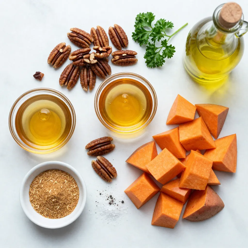 To make Maple Pecan Roasted Sweet Potatoes, you need some simple, tasty ingredients. Here’s what you will need: