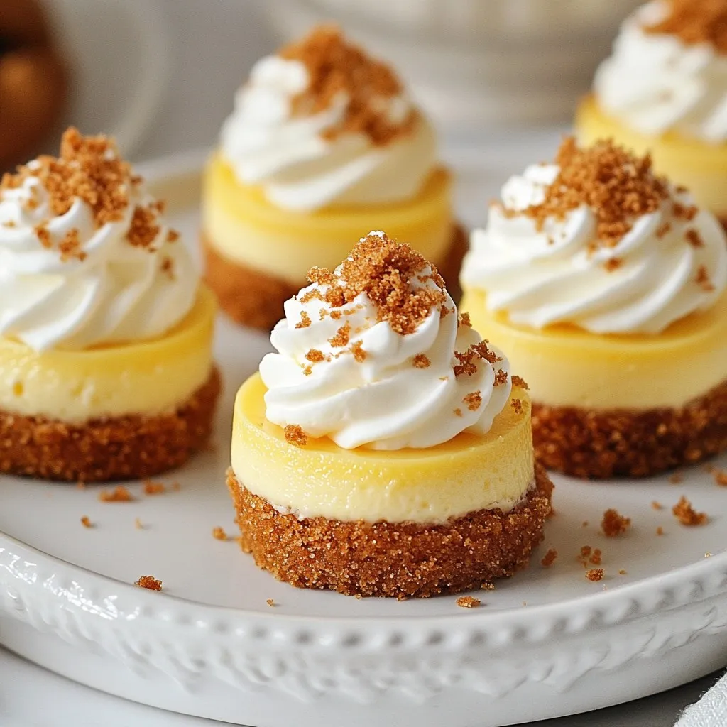 - 1 cup gingerbread cookie crumbs - 4 tablespoons unsalted butter, melted - 16 oz cream cheese, softened to room temperature - 1/2 cup granulated sugar - 1 teaspoon vanilla extract - 1 teaspoon ground ginger - 1 teaspoon ground cinnamon - 1/4 teaspoon ground nutmeg - 2 large eggs, at room temperature - 1 cup sour cream, at room temperature - Whipped cream for garnishing - Crushed gingerbread cookies for decorative topping Creating these mini gingerbread cheesecakes starts with simple ingredients. You need gingerbread cookie crumbs for the crust. These crumbs give a spicy, sweet base. Melted unsalted butter helps bind the crumbs together. Next, you’ll need cream cheese. This is the main filling. Use softened cream cheese for a smooth texture. Granulated sugar adds sweetness to balance the spices. For flavor, vanilla extract brightens the taste. Ground ginger, ground cinnamon, and ground nutmeg bring warmth and holiday vibes. Don’t forget the eggs! They help the cheesecake set. Sour cream adds creaminess and tang. Finally, for serving, whipped cream provides a fluffy topping. Crushed gingerbread cookies add a fun crunch. These ingredients come together to create a delightful treat that captures the spirit of the season. {{ingredient_image_2}} First, preheat your oven to 325°F (160°C). This will make sure your cheesecakes bake evenly. Next, line a muffin tin with paper liners. This step helps with easy removal later. In a medium bowl, mix 1 cup of gingerbread cookie crumbs and 4 tablespoons of melted butter. Stir until the crumbs are well coated and look like wet sand. Now, distribute this crumb mixture evenly into the lined muffin tin. Press down firmly to form a solid base. Bake for 8 to 10 minutes. The crust should feel firm. Once done, carefully remove it from the oven and let it cool. In a large mixing bowl, beat 16 oz of softened cream cheese with an electric mixer. Mix until it is creamy and smooth. Next, gradually add in 1/2 cup of granulated sugar while mixing. Make sure it's well blended. Add 1 teaspoon of vanilla extract, 1 teaspoon of ground ginger, 1 teaspoon of ground cinnamon, and 1/4 teaspoon of ground nutmeg to the cream cheese mixture. Mix until everything is evenly combined. Now, introduce 2 large eggs, one at a time. Beat gently after each addition to keep the mixture airy. Finally, fold in 1 cup of sour cream and mix until the filling is smooth and creamy. Carefully pour the cheesecake filling over the cooled crusts. Fill each cup about three-quarters full. Return the muffin tin to the oven. Bake for 20 to 25 minutes. Watch for a slight jiggle in the center. This means they are done. Once baked, turn off the oven but leave the door slightly open. Let the cheesecakes cool gently inside for an hour. This helps prevent cracks. After cooling, transfer them to the refrigerator. Chill for at least 4 hours or ideally overnight to set properly. - Use room temperature ingredients for smooth mixing: Take your cream cheese, eggs, and sour cream out ahead of time. This helps them blend well without lumps. - Avoid overbeating eggs for fluffy texture: Beat the eggs just until combined. Overmixing can make the cheesecake dense and heavy. - Efficient cooling methods to prevent cracks: After baking, crack the oven door and let the cheesecakes cool slowly. This helps prevent cracks on the surface. - How to garnish with whipped cream: Use a piping bag to add a swirl of whipped cream on top. This makes each cheesecake look fancy and inviting. - Using crushed cookies for festive flair: Sprinkle crushed gingerbread cookies on top of the whipped cream. This adds a fun and crunchy touch. - Serving suggestions and presentations: Present your mini cheesecakes on a festive platter. Add whole gingerbread cookies and a sprinkle of cinnamon for extra charm. - Overcooking the cheesecakes: Keep an eye on the baking time. The centers should jiggle slightly when you remove them from the oven. - Not allowing them to cool properly: Letting them cool in the oven prevents sudden temperature changes that cause cracks. - Skipping chilling time for best texture: Chill for at least four hours, or better yet, overnight. This ensures a creamy, smooth texture for each bite. Pro Tips Use Room Temperature Ingredients: Make sure your cream cheese and eggs are at room temperature before mixing. This helps create a smoother filling without lumps. Prevent Cracking: Allow the cheesecakes to cool gradually in the oven with the door slightly ajar after baking. This helps prevent cracks in the surface. Chill Overnight: For the best flavor and texture, let the cheesecakes chill in the refrigerator overnight. This allows the flavors to meld beautifully. Garnish with Care: When topping with whipped cream and crushed gingerbread, use a piping bag for a professional finish and even distribution for presentation. {{image_4}} You can mix things up with mini gingerbread cheesecakes. Try these fun flavors: - Pumpkin spice mini cheesecakes: Add pumpkin puree and pumpkin spice for a fall twist. This brings warmth and a cozy feel to your dessert. - Chocolate gingerbread cheesecakes: Blend cocoa powder into the cream cheese mixture. This gives a rich chocolate taste that pairs well with gingerbread. - Nut-free options: If you want a nut-free treat, simply skip any nuts in your toppings. You can still enjoy the same great flavors. Making these cheesecakes fit your diet is easy! Here are some swaps you can try: - Gluten-free crust options: Use gluten-free gingerbread cookies for the crust. They taste great and keep the recipe simple. - Dairy-free cream cheese alternatives: Swap traditional cream cheese with dairy-free cream cheese. This change keeps the texture smooth while being dairy-free. - Sugar substitutes for healthier options: You can use stevia or monk fruit sweetener instead of sugar. This makes your cheesecakes lower in calories but still sweet. Get creative with seasonal touches! Here are some ideas to bring a festive spi