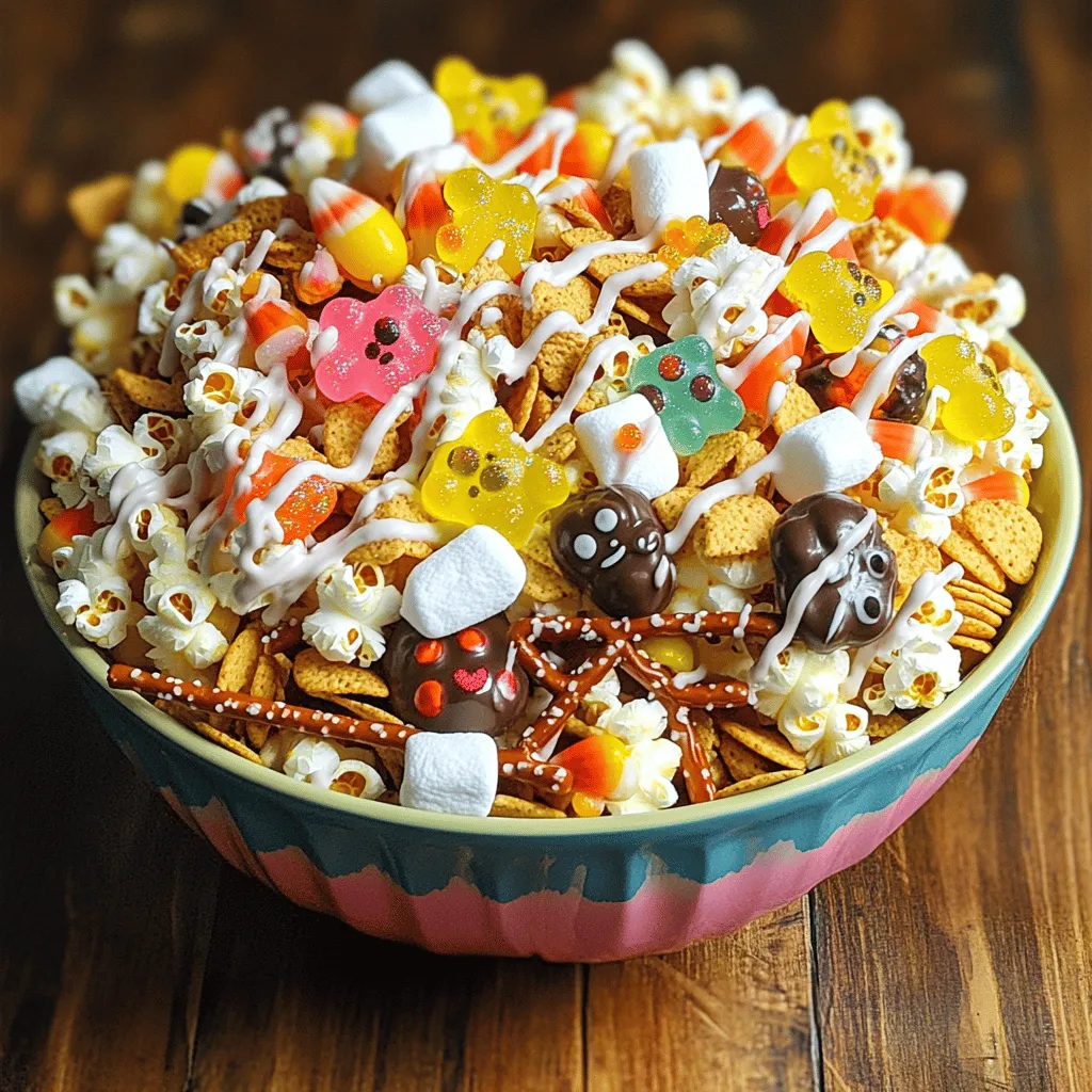 When making Monster Munch Snack Mix, mix gently. You want each piece to stay whole. Start by adding the popcorn to a big bowl. Then, add the mini pretzels, corn chips, gummy monsters, and chocolate candies. Toss in the candy corn, sunflower seeds, and mini marshmallows. Use a spatula to fold everything together. This keeps the mix light and fun. Make sure all the treats get coated with the melted white chocolate. This helps bind them together and adds flavor.