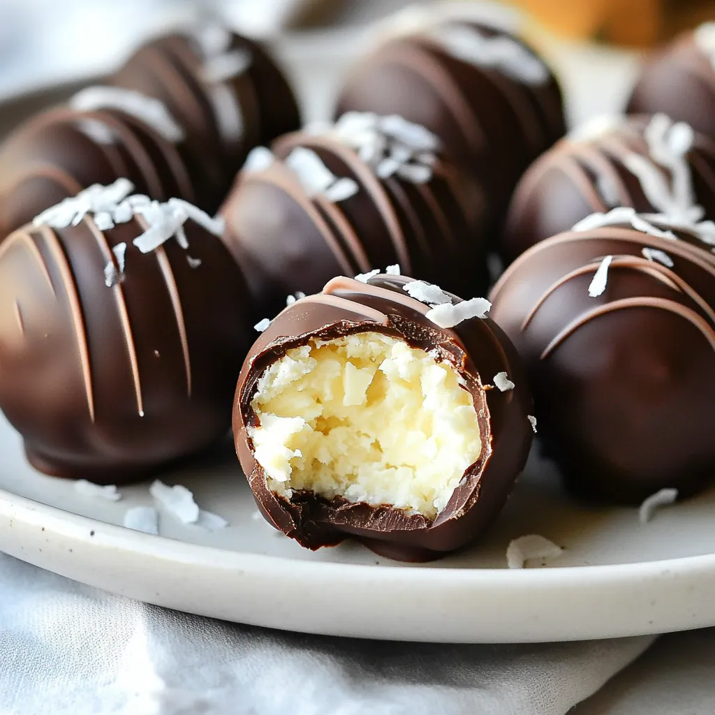 To make No-Bake Coconut Cream Balls, you need a few simple ingredients. Here’s the list: - 1 cup unsweetened shredded coconut - 1 cup almond flour - 1/4 cup pure maple syrup - 1/4 cup coconut cream - 1 teaspoon pure vanilla extract - A pinch of sea salt - 1/2 cup dark chocolate chips (dairy-free if preferred) - Extra shredded coconut for rolling These ingredients come together to create a delightful treat. The unsweetened shredded coconut gives a great base, while the almond flour adds a nice nutty flavor. Pure maple syrup brings sweetness without being too overpowering. Coconut cream adds creaminess, making the bites rich and satisfying. The vanilla extract enhances the overall taste, and a pinch of sea salt balances the sweetness. Using dark chocolate chips on the outside adds a perfect touch. You can choose dairy-free chips for a vegan option. Finally, rolling the balls in extra shredded coconut gives them a beautiful finish. Each ingredient plays a key role in making these treats both tasty and visually appealing. Enjoy the process of gathering these items; it’s part of the fun! {{ingredient_image_2}} To start, grab a large mixing bowl. Here, you will combine 1 cup of unsweetened shredded coconut with 1 cup of almond flour. Stir these two until they blend well. Next, add in 1/4 cup of pure maple syrup and 1/4 cup of coconut cream. Don't forget the 1 teaspoon of pure vanilla extract and a pinch of sea salt. Mix everything together until you get a sticky dough. Now it's time to shape the mixture. Scoop out small portions, about 1 tablespoon each. Roll them into smooth 1-inch balls. Place these coconut balls on a parchment-lined tray. Make sure they are spaced apart to avoid sticking. Put the tray in the refrigerator for about 30 minutes. This helps the balls firm up and keeps their shape. While the coconut balls chill, melt the dark chocolate chips. Use a microwave-safe bowl. Heat the chips in intervals of 20 seconds. Stir after each interval until you achieve a silky smooth consistency. Take the chilled coconut balls out of the fridge. One by one, dip each ball in the melted chocolate. Make sure each ball is fully coated. After that, roll them in extra shredded coconut for a nice garnish. Transfer the chocolate-coated coconut balls back onto the tray. Place them in the refrigerator for an additional 15 minutes. This allows the chocolate to set and harden. To get the right texture for your Coconut Bliss Bites, mix the ingredients well. Start with unsweetened shredded coconut and almond flour. Then, add the maple syrup, coconut cream, and vanilla extract. A pinch of sea salt will enhance the flavors. You should see a sticky dough form. If your mixture feels too dry, add more coconut cream. If it’s too wet, add a little almond flour. You can easily add your favorite flavors to these bites. Try mixing in a few drops of almond or coconut extract. A sprinkle of cinnamon or nutmeg can also add warmth. If you like a tropical twist, consider adding lime zest or even a bit of pineapple juice. Each addition creates a unique flavor experience. Melting chocolate can be tricky. To avoid scorched chocolate, use a microwave-safe bowl. Heat the dark chocolate chips in short bursts. Start with 20 seconds, then stir. Repeat until the chocolate is melted and smooth. If it becomes too thick, add a tiny bit of coconut oil to thin it out. This method ensures a silky, shiny finish for your coated coconut balls. Pro Tips Chill for Better Coating: Make sure to chill the coconut balls for at least 30 minutes before dipping them in chocolate. This helps them hold their shape and makes the coating process easier. Use Quality Chocolate: Choose high-quality dark chocolate for melting to enhance the flavor of your Coconut Bliss Bites. Dairy-free options are available if you prefer. Experiment with Flavors: Feel free to add your favorite extracts, like almond or coconut, to the mixture for a unique twist on the flavor profile. Storage Tips: Store the Coconut Bliss Bites in an airtight container in the refrigerator for up to a week, or freeze them for longer storage. {{image_4}} If you want a nut-free version of these treats, you can swap the almond flour. Try using oat flour instead. Oat flour is easy to make. Just blend rolled oats until fine. It adds a nice flavor and texture. You can also use sunflower seed flour. This option is great for kids with nut allergies. To make this dessert vegan, check all your ingredients. Use a plant-based chocolate. Make sure the chocolate chips are dairy-free. Also, ensure the coconut cream is pure and free from additives. The other ingredients are already vegan-friendly. This way, everyone can enjoy these delicious bites! You can change the flavor and make them your own! Add in some dried fruits like cranberries or mango. You might also try mixing in nuts like pecans or walnuts if you want some crunch. For a fresh twist, add a bit of lemon or orange zest. This will give your coconut balls a bright flavor. Get creative and have fun with it! To keep your Coconut Bliss Bites fresh, store them in the fridge. Use an airtight container to avoid moisture. Place a layer of parchment paper between layers if stacking them. This helps prevent them from sticking together. You can freeze these coconut balls for later. First, place them on a tray and freeze until solid. Once frozen, transfer them to a freezer-safe bag. Label the bag with the date. To enjoy, simply thaw them in the fridge overnight. These coconut cream balls last about one week in the fridge. After that, they may lose their taste and texture. If stored properly in the freezer, they can last up to three months. Yes, you can! Honey is a great substitute for maple syrup. It adds sweetness but has a different flavor. Agave syrup works too, giving a milder taste. If you want something less sweet, try using date syrup. Each option will change the taste a little, so pick what you like best. You need to chill the mixture for about 