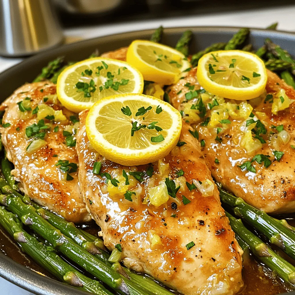Now, slice the second lemon into rounds. Scatter these slices over the chicken. This adds extra flavor as it bakes. Slide the baking sheet into your preheated oven. Bake for about 25 to 30 minutes. To check for doneness, use a meat thermometer. The chicken should reach 165°F (75°C), and the asparagus should be tender but not mushy. Once done, take it out and let it rest for 5 minutes. This helps the juices settle in the chicken. Before serving, sprinkle with fresh parsley for a bright touch.