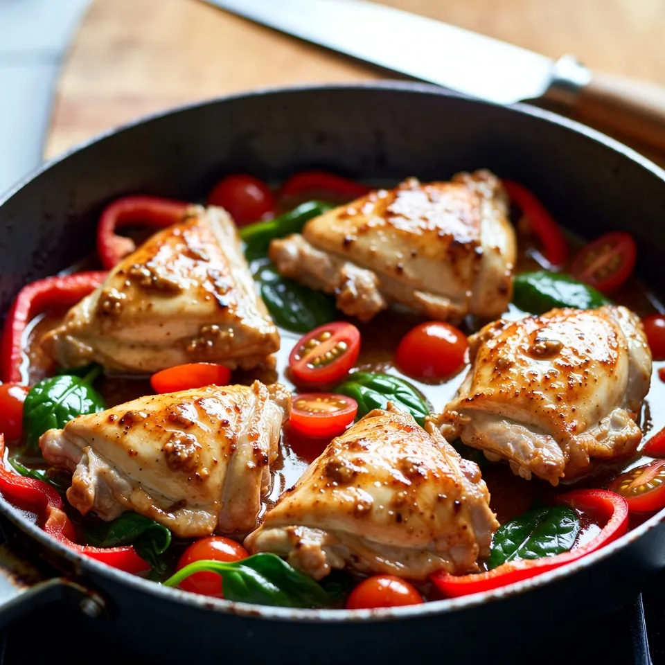 - Add Vegetables: Lower the heat to medium, and introduce the sliced red bell pepper, halved cherry tomatoes, and baby spinach to the skillet. Mix the vegetables gently around the chicken, creating a vibrant bed for the meal.