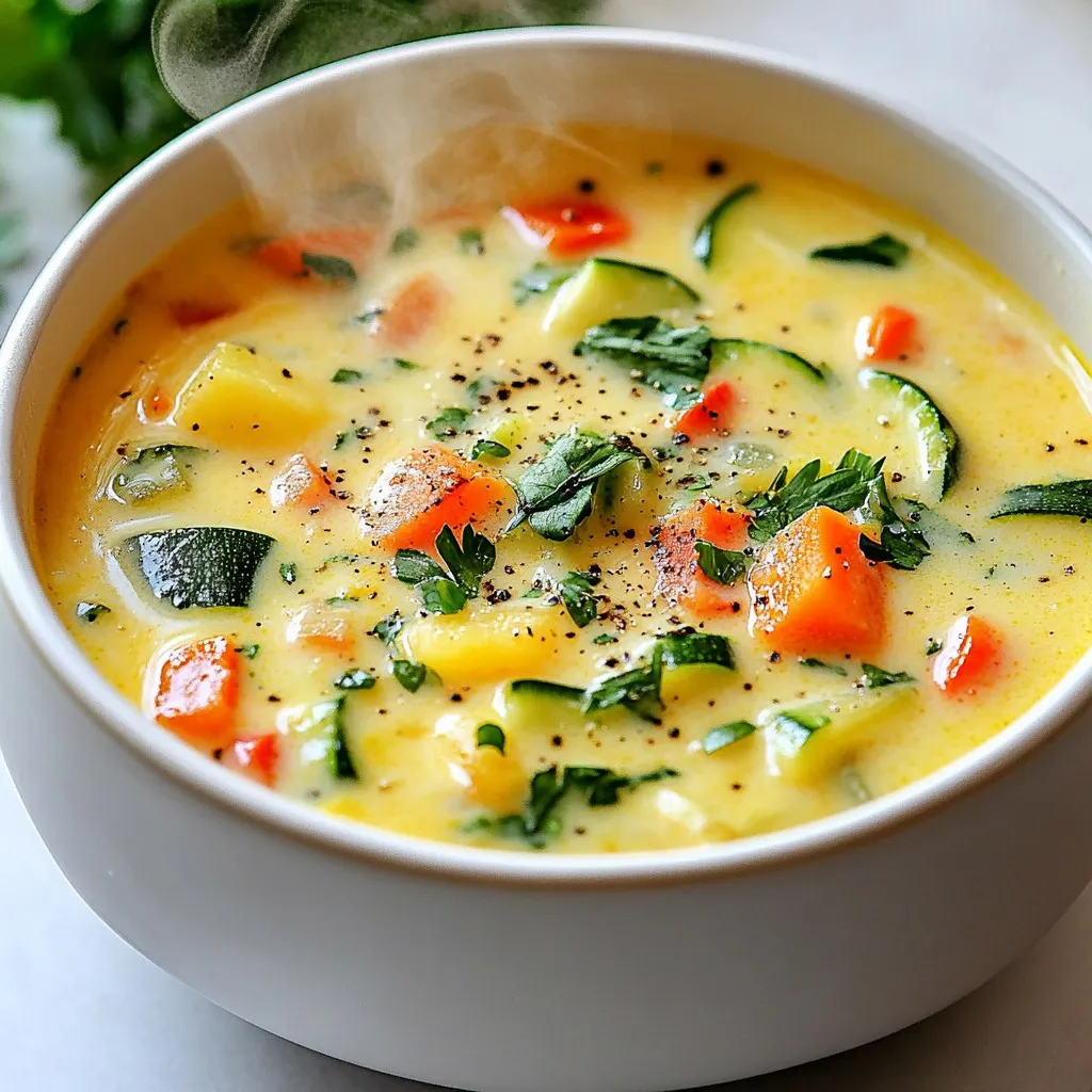 Cooking a great soup starts with the right ingredients. Here’s what you need for my One-Pot Creamy Veggie Soup: - 1 tablespoon olive oil - 1 medium onion, diced - 3 cloves garlic, minced - 2 medium carrots, diced - 1 medium zucchini, diced - 1 red bell pepper, diced - 2 cups fresh spinach, roughly chopped - 4 cups vegetable broth (low-sodium preferred) - 1 cup coconut milk (canned or carton) - 1 teaspoon dried thyme - 1 teaspoon dried basil - Salt and pepper to taste - 2 tablespoons nutritional yeast (optional, for a cheesy flavor) - Fresh parsley, chopped (for garnish) Each ingredient adds its own flavor and nutrition. For example, olive oil gives a rich base. The onion and garlic bring a wonderful aroma. Carrots, zucchini, and red bell pepper add sweetness and color. Fresh spinach boosts the nutrients. Coconut milk makes the soup creamy and smooth. Nutritional yeast adds a cheesy taste. It’s optional, but I like it! Finally, fresh parsley adds a pop of color and freshness. You’ll love how these simple ingredients come together to create a comforting meal. {{ingredient_image_2}} - Sautéing the onion: Start by heating one tablespoon of olive oil in a large pot over medium heat. When the oil is hot, add one medium diced onion. Cook it for about three to four minutes, stirring often. You want the onion to become soft and clear. - Adding garlic: Next, stir in three cloves of minced garlic. Let it cook for one minute. This step makes the kitchen smell amazing and brings out the garlic flavor. - Incorporating carrots, zucchini, and bell pepper: Now, add two diced medium carrots, one diced zucchini, and one diced red bell pepper to the pot. Cook these veggies for five to seven minutes. Stir occasionally. You want them to soften and turn bright. - Bringing out the flavors: This step helps the vegetables release their natural sweetness. The colors will pop, making your soup look even more inviting. - Adding broth and coconut milk: Pour in four cups of low-sodium vegetable broth and one cup of coconut milk. Stir well to mix everything together. This combination creates a creamy base for your soup. - Seasoning to taste: Sprinkle in one teaspoon of dried thyme and one teaspoon of dried basil. Add salt and pepper as you like. Raise the heat a bit until the soup starts to boil. Then, lower the heat and let it simmer for about ten to fifteen minutes. This allows the flavors to blend and the veggies to get tender. - Incorporating greens and nutritional yeast: Once the vegetables are tender, stir in two cups of roughly chopped fresh spinach. If you want a cheesy flavor, add two tablespoons of nutritional yeast. Let the soup simmer for another two to three minutes until the spinach wilts. - Blending and serving suggestions: Taste the soup and adjust the seasoning if needed. For a smooth soup, use an immersion blender to blend it to your liking. If you prefer chunks, blend only half. Serve it hot in bowls, garnished with fresh chopped parsley for a nice touch. Seasoning is key to great soup. Use salt and pepper to bring out flavors. Start with a pinch of salt. Taste as you cook. Add more if needed. Fresh herbs also boost flavor. Choose a low-sodium vegetable broth for balance. A good broth enhances taste without overpowering the soup. Coconut milk adds a rich texture. Use full-fat for a creamier feel. Stir it in after the broth. If you want a different taste, try cashew cream or almond milk. These options keep it dairy-free. Nutritional yeast adds a cheesy flavor without dairy. It’s optional but worth it for extra taste. Serve the soup with crusty bread or a fresh salad. Bread soaks up the soup well. A sprinkle of fresh parsley brings color. You can also drizzle olive oil on top. This gives it a nice finish. For a kick, add red pepper flakes. It’s all about what you enjoy! Pro Tips Fresh Vegetables: Using fresh, seasonal vegetables will enhance the flavor and nutritional value of your soup. Adjusting Creaminess: For a richer soup, add an extra splash of coconut milk or a dollop of dairy-free cream just before serving. Flavor Boost: Incorporate a squeeze of lemon juice or a dash of vinegar just before serving for a bright flavor contrast. Storage Tips: This soup stores well in the fridge for up to 3 days and can be frozen for up to a month—just leave out the spinach until reheating. {{image_4}} You can switch up the veggies in this soup. Try using broccoli, cauliflower, or green beans. Each gives a new taste and texture. You can also add potatoes for creaminess. If you want a rich base, use sweet potatoes too. For a creamy touch, you can change the coconut milk. Almond milk or oat milk work well too. Both add a nice flavor while keeping it smooth. Choose unsweetened varieties to avoid extra sugar. Want to make this soup more filling? You can add beans or lentils. Black beans or chickpeas are great options. They add protein and fiber. If you prefer lentils, red or green ones cook fast and blend well. You can also use vegan meat. Products like tempeh or seitan can add texture. Just cut them into small pieces and cook them with the veggies. This gives your soup a hearty twist. Adding herbs and spices can change the soup's flavor. Fresh herbs like parsley or cilantro brighten it up. You can also try adding dill or oregano for a different taste. For a spicy kick, add a pinch of red pepper flakes or diced jalapeños. Experimenting with spices can also enhance the flavor. Smoked paprika or curry powder can give a warm depth. Just start with a small amount and adjust to your taste. Store your leftover soup in airtight containers. This keeps it fresh and tasty. Let the soup cool before sealing it up. It can stay in the fridge for about three to four days. If you want to enjoy it later, make sure to check for any signs of spoilage. You can freeze the soup for longer storage. Use freezer-safe containers or bags. Leave some space at the top, as the soup will expand when frozen. This soup can last in the f