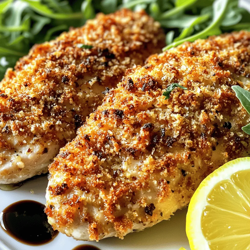 To make this dish, you need some key ingredients: - 4 boneless, skinless chicken breasts - 1 cup finely grated Parmesan cheese - 1 cup seasoned breadcrumbs - 1 teaspoon garlic powder - 1 teaspoon onion powder - 1 teaspoon dried Italian herbs (a blend of oregano, basil, and thyme) - 2 large eggs - 1 tablespoon Dijon mustard - Salt and freshly ground pepper to taste - Olive oil for drizzling Each ingredient plays an important role in creating a tasty crust. The Parmesan cheese gives a rich, nutty flavor. The breadcrumbs add crunch, while the herbs and spices bring depth. You can add some optional ingredients to boost the flavor: - Fresh parsley for garnish - Lemon zest for brightness - Red pepper flakes for heat - A sprinkle of smoked paprika for a unique twist These extras can personalize your dish. Try adding lemon zest for a fresh kick or red pepper flakes for a bit of spice. Parmesan crusted chicken pairs well with many sides: - Roasted vegetables for a healthy touch - Mashed potatoes for comfort food - A fresh garden salad for crunch - Pasta tossed in garlic and olive oil for a hearty meal Choosing the right side dish can enhance the meal. A bright salad balances the richness of the chicken, while roasted veggies add color and nutrition. For more details on cooking this dish, check out the Full Recipe. Start by preheating your oven to 400°F (200°C). This step is key for crispy chicken. Take your baking sheet and line it with parchment paper. This will help the chicken not stick. Next, grab the chicken breasts and pat them dry with paper towels. This helps the coating stick better. After drying, season both sides of the chicken with salt and freshly ground pepper. In a shallow bowl, whisk together the eggs and Dijon mustard. You want a smooth mix here. In another bowl, mix the grated Parmesan cheese, seasoned breadcrumbs, garlic powder, onion powder, and dried Italian herbs. Stir it well to blend all the flavors. Now, take each chicken breast and dip it into the egg mixture first. Let the excess drip off. Then, transfer it to the breadcrumb mix. Press down to make sure the coating sticks well. This step is vital for a crunchy crust. Place the coated chicken breasts on the prepared baking sheet. Drizzle a little olive oil over each piece. This adds flavor and helps brown the crust. Bake the chicken in your preheated oven for 25-30 minutes. Check that the chicken reaches an internal temperature of 165°F (75°C). It should be golden brown on the outside. Once baked, take the chicken out and let it rest for about 5 minutes. This helps keep the juices inside. If you need the full recipe, check the earlier section in this article. To get that perfect crispy coating, start with dry chicken. Pat your chicken breasts with paper towels. This helps the coating stick better. Use fresh breadcrumbs for the crunchiest texture. Press the breadcrumb mixture firmly onto the chicken. This ensures a thick layer that crisps up nicely in the oven. Drizzling olive oil on top before baking also helps create a golden brown crust. Seasoning is key to great taste. Use garlic powder and onion powder for a savory touch. Dried Italian herbs add a nice herb flavor. Feel free to adjust the seasoning to your liking. A pinch of red pepper flakes can add a hint of heat. Don't be shy with salt and pepper; they enhance all the other flavors. If you have leftovers, store them in an airtight container. This keeps the chicken fresh and moist. Place a paper towel in the container to absorb excess moisture. When you're ready to eat, reheat the chicken in an oven for best results. This helps keep the coating crispy. You can also enjoy it cold in a salad or sandwich. {{image_4}} You can change the herbs in the recipe to match your taste. Try using fresh herbs like rosemary, parsley, or thyme. You can also mix in some smoked paprika for a slight kick. This gives your chicken a new twist while keeping it delicious. Each herb adds its own flair, so feel free to experiment. If you want to switch up your protein, you have options. You can use turkey cutlets, which work well and cook quickly. Pork chops are another great choice; just adjust the cooking time a bit. For a leaner option, consider using fish like salmon or tilapia. These can also be coated and baked for a tasty change. For a gluten-free version, use crushed rice crackers or gluten-free breadcrumbs. You can also try ground almonds or cornmeal as a coating. These alternatives will give you a nice crunch without the gluten. Just ensure you check that all your other ingredients are gluten-free too. Now, you can enjoy Parmesan crusted chicken in many ways! For the full recipe, don't forget to check the instructions on how to make this dish perfectly. To store leftover Parmesan crusted chicken, let it cool first. Place it in an airtight container. Make sure to separate the pieces with parchment paper to avoid sticking. You can store it in the fridge for up to three days. Keep it away from strong-smelling foods to preserve its flavor. For the best results when reheating, use an oven. Preheat your oven to 350°F (175°C). Place the chicken on a baking sheet. Cover it with foil to keep it moist. Heat for about 10-15 minutes, until warm. Check that it reaches an internal temperature of 165°F (75°C). This method keeps the crust crispy. If you want to freeze Parmesan crusted chicken, wrap each piece in plastic wrap. Then, place them in a freezer bag. Remove as much air as possible to prevent freezer burn. You can freeze it for up to three months. When ready to eat, thaw in the fridge overnight. Reheat in the oven as mentioned above for the best taste. For the full recipe, check the earlier sections for detailed steps on making this delicious dish! You can tell when your Parmesan Crusted Chicken is done by checking its temperature. Use a meat thermometer. It should read 165°F (75°C) in the thickest part. The chicken should also be golden brown and have a crispy crust. If you cu