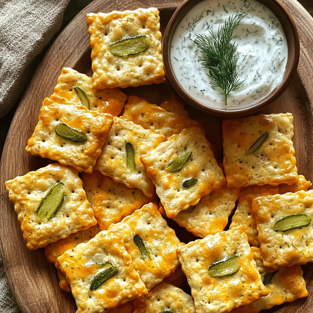 ![To make Pickle Ranch Snack Crackers, you need the following ingredients: - 1 cup all-purpose flour - 1/2 cup cornmeal - 1 teaspoon baking powder - 1/2 teaspoon baking soda - 1/2 teaspoon salt - 1 tablespoon ranch seasoning mix - 1/4 cup dill pickle juice - 1/4 cup melted butter (cooled slightly) - 1/2 cup shredded cheddar cheese - 1/4 cup dill pickle slices (finely chopped) You can swap some ingredients if needed. For the all-purpose flour, try using whole wheat flour for added fiber. If you prefer a gluten-free option, use a gluten-free flour blend. Instead of cornmeal, you can use fine breadcrumbs for a different texture. If you want to skip the ranch seasoning, use herbs like dill, garlic powder, or onion powder to create your own flavor. Each serving, which is about two crackers, provides: - Calories: 120 - Total Fat: 8g - Saturated Fat: 4g - Cholesterol: 20mg - Sodium: 150mg - Carbohydrates: 10g - Fiber: 1g - Sugar: 1g - Protein: 3g These crackers are tasty and balanced, making them a fun snack for any occasion. You can enjoy them without guilt! 1. Preheat your oven to 350°F (175°C). This is key for baking. 2. Line a baking sheet with parchment paper. This helps with easy cleanup. 3. In a large bowl, mix the flour, cornmeal, baking powder, baking soda, salt, and ranch seasoning. Use a whisk to mix well. 4. Slowly add the dill pickle juice and melted butter. Stir until a dough forms. 5. Fold in the cheddar cheese and chopped dill pickles. Make sure they spread evenly in the dough. 6. Roll the dough into small balls, about the size of a quarter. Place them on the sheet, leaving space between them. 1. Flatten each ball gently with a fork or your fingers. Aim for even thickness. 2. Bake the crackers for 12-15 minutes. Watch closely for a light golden brown color. 1. Once baked, let the crackers cool on the sheet for a few minutes. 2. Transfer them to a wire rack to cool completely. This makes them crispier. 3. For a fun serving idea, arrange them on a colorful platter. Add fresh dill sprigs or serve with ranch dip for a tasty snack. Enjoy your Pickle Ranch Snack Crackers! You can find the full recipe above for more details. To get the right texture for your Pickle Ranch Snack Crackers, focus on mixing. Combine the dry ingredients well to avoid lumps. When adding the wet ingredients, mix just until combined. Overmixing can make your crackers tough. Roll the dough into small balls. Keep them uniform in size to ensure even baking. Flatten them gently for a crispier edge. To boost flavor, consider adding more ranch seasoning. You could also try garlic powder or onion powder. A pinch of cayenne can add a nice kick if you like spice. Adding herbs like dill or parsley can enhance the pickle flavor. For extra richness, sprinkle some grated Parmesan cheese on top before baking. One common mistake is using hot melted butter. It can change the dough's texture. Be careful not to skip the cooling step after baking. Allowing them to cool helps the crackers firm up. Also, don’t crowd the baking sheet. If they are too close, they may stick together. Check them often while baking to avoid burning. For a full recipe, refer to the complete instructions. {{image_4}} You can add fun twists to Pickle Ranch Snack Crackers. Want some heat? Try adding cayenne pepper or crushed red pepper flakes. Just a pinch will do! For a cheesy version, swap in pepper jack cheese instead of cheddar. Mixing in some garlic powder can also boost flavor. These tweaks keep your snack game exciting! If you need a gluten-free option, use gluten-free all-purpose flour. It works well in this recipe. You can also try almond flour for a nutty taste. Make sure your ranch seasoning is gluten-free too. This way, everyone can enjoy these tasty crackers without worry. These crackers shine when paired with dips. Creamy ranch dip is a favorite, but you can also serve them with hummus or guacamole. For a fun party snack, arrange them on a platter with fresh veggies. They also taste great with cheese slices or charcuterie. Each bite will surprise your guests! Explore the [Full Recipe] to start making your own delicious Pickle Ranch Snack Crackers today! Store your Pickle Ranch Snack Crackers in an airtight container. This keeps them fresh and crisp. You can use a glass jar or a plastic container. Make sure they are completely cool before sealing. If you live in a humid area, consider adding a small bag of rice to absorb moisture. When stored properly, these crackers can last up to one week. They taste best in the first few days. After that, they may lose some crunch. If you want to keep them longer, you can freeze them. Just place them in a freezer-safe bag or container. If your crackers lose their crunch, you can reheat them. Preheat your oven to 300°F (150°C). Spread the crackers on a baking sheet in a single layer. Heat them for about 5-7 minutes. Check often to avoid burning. Let them cool before enjoying again. For the full recipe, refer to the earlier section. Pickle Ranch Snack Crackers are tasty, crunchy treats. They mix the flavors of dill pickles and ranch dressing. These snacks are perfect for parties or game nights. They are easy to make at home with simple ingredients. To make Pickle Ranch Snack Crackers at home, follow these steps: 1. Preheat your oven to 350°F (175°C). 2. Line a baking sheet with parchment paper. 3. Mix flour, cornmeal, baking powder, baking soda, salt, and ranch seasoning in a bowl. 4. Add dill pickle juice and cooled melted butter. Stir to form a dough. 5. Fold in cheddar cheese and chopped pickles. 6. Roll the dough into small balls. Flatten each ball on the baking sheet. 7. Bake for 12-15 minutes until golden. 8. Let them cool on a wire rack. For the full recipe, check the details provided above. Pickle Ranch Snack Crackers can be a fun snack. They contain some healthy ingredients like cheese and pickles. However, they also have butter and flour, which add calories. Enjoy them in moderation as part o