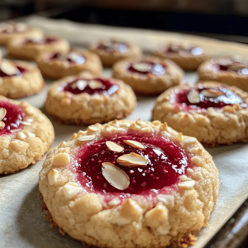 ![The ingredients for Raspberry Almond Thumbprint Cookies are simple and delightful. Each one plays a key role in creating the perfect cookie. - 1 cup unsalted butter, softened to room temperature - 3/4 cup granulated sugar - 1 cup almond flour - 2 cups all-purpose flour - 1/2 teaspoon fine sea salt - 1 teaspoon pure vanilla extract - 1/4 teaspoon pure almond extract - 1/2 cup raspberry jam - Optional: Sliced almonds for garnish Using high-quality ingredients makes a big difference. The unsalted butter gives a rich flavor and smooth texture. Granulated sugar adds sweetness and helps the cookies spread just right. Almond flour brings a nutty taste that pairs well with raspberry jam. The fine sea salt balances the sweetness and enhances all the flavors. Vanilla and almond extracts add depth to the cookies. Raspberry jam gives that burst of fruity goodness, making each bite a treat. If you want a bit of crunch, sliced almonds add a lovely touch. For the complete recipe, check out the Full Recipe. Make sure you have everything ready before you start. Happy baking! - Preheat the oven to 350°F (175°C). This step ensures your cookies bake evenly and rise well. While the oven heats, line two baking sheets with parchment paper. This prevents cookies from sticking. - Cream the butter and sugar. In a large bowl, mix the softened butter and sugar until light and fluffy. This takes about 2-3 minutes. - Combine the dry ingredients and mix in the flavorings. Gradually add almond flour, all-purpose flour, and sea salt. Stir until a soft dough forms. Then, pour in vanilla and almond extracts and mix until smooth. - Roll the dough into balls. Use your hands to shape 1-inch balls and place them on the baking sheets. Make sure to space them about 2 inches apart, so they have room to spread. - Create indentations in each ball. Use your thumb or a small spoon to press down in the center of each dough ball. This creates a well for the jam. - Fill each indentation with raspberry jam. Carefully add about 1 teaspoon of jam to each well. Be careful not to overfill, or it may spill during baking. - Optional: For a crunchy texture, press sliced almonds around the edges of the filled indentations. - Bake the cookies. Place the baking sheets in the oven and bake for 12 to 15 minutes. Look for lightly golden edges. - Cooling instructions: After baking, let the cookies sit for about 5 minutes on the baking sheets. This helps them firm up. Then, transfer them to a wire rack to cool completely. - Presentation tips: Once cooled, dust the cookies lightly with powdered sugar. Arrange them on a decorative platter with fresh raspberries and mint leaves for a vibrant look. Check out the Full Recipe for more details and tips! Achieving the perfect texture To get soft and chewy cookies, use softened butter. This helps create the right mix of air and fat. Make sure to cream it well with the sugar. Mixing should take about 2 to 3 minutes. If you want a slight crunch, use finely ground almond flour. This gives the cookies a nice bite. Ensuring even cooking For even baking, space the cookie balls well on the baking sheet. Place them about 2 inches apart. This helps prevent them from sticking together. Additionally, rotate the baking sheets halfway through the baking time. This ensures all cookies bake evenly. Recommended amendments for enhanced flavor To boost the almond flavor, add a bit more almond extract. Just a few extra drops can make a big difference. You can also add a pinch of cinnamon for warmth. It pairs well with the raspberry jam and adds depth to the taste. Alternative fillings for the thumbprint While raspberry jam is great, try other flavors too! Strawberry, apricot, or even lemon curd can work well. Each jam gives a unique twist to the cookies. You can also use chocolate ganache for a rich, sweet center. Avoiding overfilling the jam When filling the cookie indentations, use about 1 teaspoon of jam. If you add too much, it can overflow during baking. This can make a mess on your baking sheet. Stick to the recommended amount for best results. Preventing dough from spreading too much in the oven If your dough spreads too much, try chilling it for about 30 minutes before baking. This helps firm up the butter. You can also bake on parchment paper, which helps maintain shape. Keeping your dough cold is key to keeping those lovely thumbprint shapes! {{image_4}} You can play with flavors in Raspberry Almond Thumbprint Cookies. Using different fruit jams can change the taste. Try strawberry, apricot, or blueberry jam for a fun twist. Each jam brings its unique flavor, making each bite special. You can also add chocolate or citrus flavors. Mix in some cocoa powder for a chocolatey touch. Or, add a hint of lemon zest for a fresh kick. These small changes can give your cookies a new vibe. Making these cookies gluten-free is easy. Substitute regular flour with gluten-free flour blends. Look for blends that include almond or coconut flour. These options keep the cookies soft and chewy. To maintain the right texture, watch the moisture levels. Gluten-free flour often absorbs more liquid. You may need to adjust the butter or add a bit of milk. This keeps the cookies from being too dry or crumbly. You can make these cookies vegan too. Replace butter with coconut oil or vegan butter. Both options keep the cookies rich and tasty. For eggs, use flaxseed meal or applesauce. These act as great binding agents. Flaxseed meal is simple to use. Mix one tablespoon with three tablespoons of water. Let it sit for a few minutes until it thickens. This blend works well and keeps the cookies together. To keep your Raspberry Almond Thumbprint Cookies fresh, store them in an airtight container at room temperature. This helps prevent them from getting stale. I recommend enjoying them within 5 to 7 days for the best taste. If you want to save some cookies for later, you can freeze them. For baked cookies, let them cool completely. Then, place them in