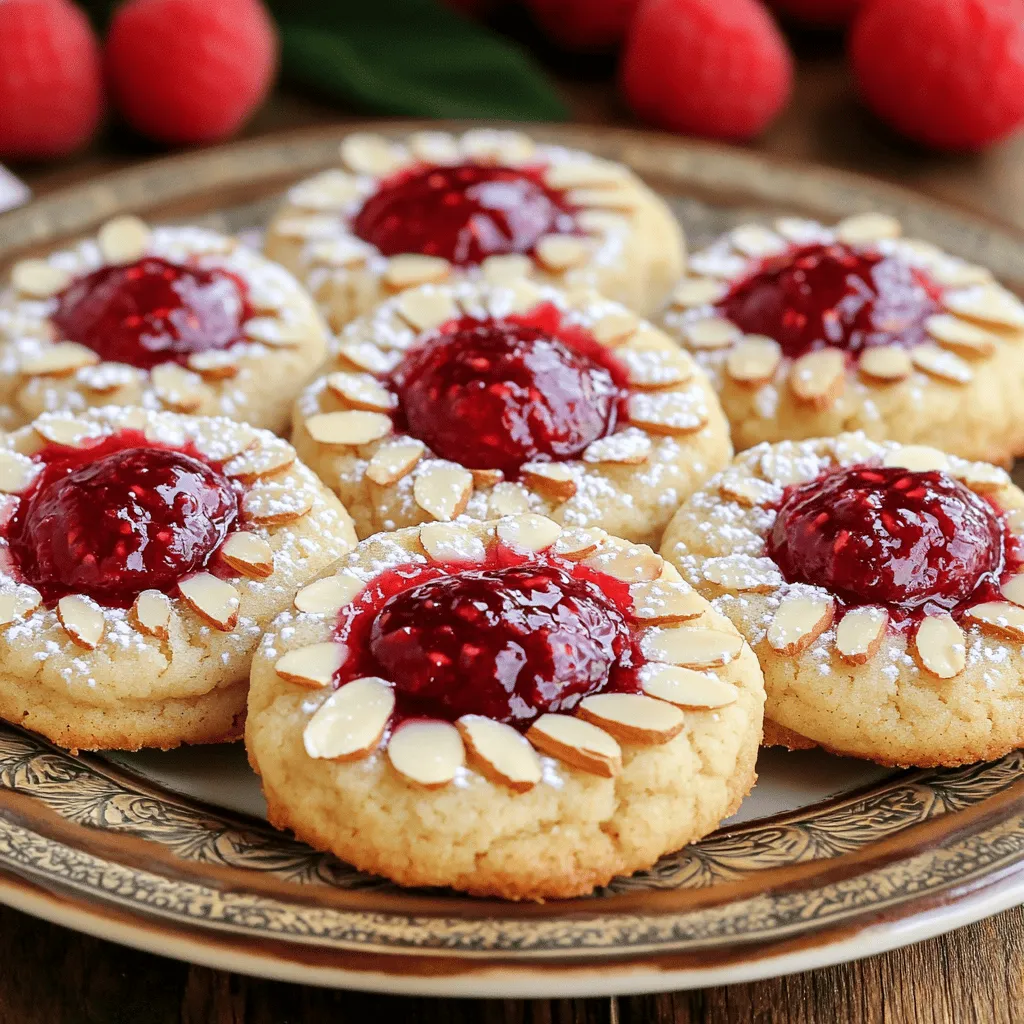For a beautiful presentation, arrange the cookies on a decorative plate. Scatter fresh raspberries around them for color. Enjoy your delicious Raspberry Almond Thumbprint Cookies!