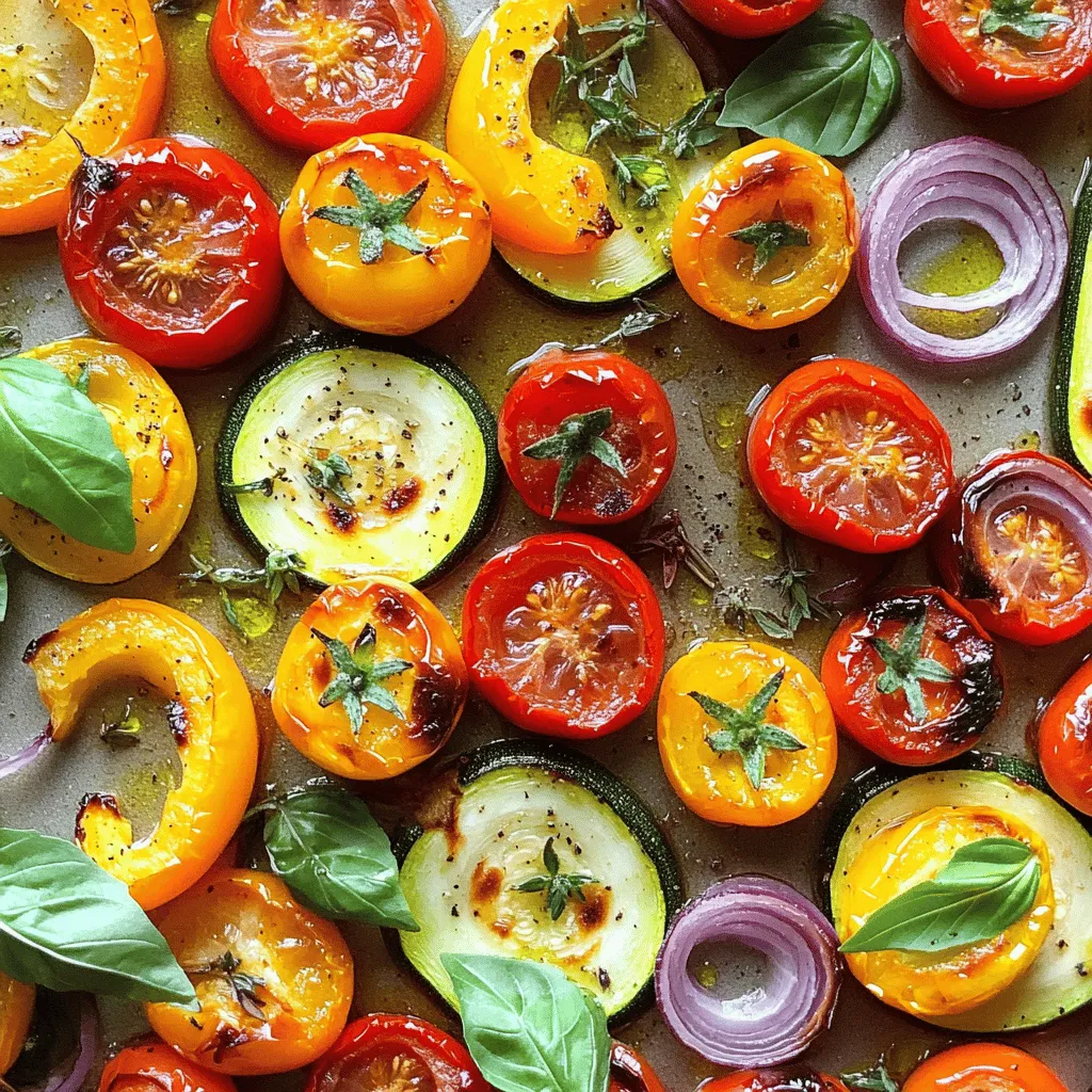 ![For this recipe, you will need: - 2 cups zucchini, sliced into rounds - 2 cups mixed bell peppers (red, yellow, and orange), chopped into bite-sized pieces - 1 cup cherry tomatoes, halved - 1 cup red onion, thinly sliced - 3 cloves garlic, minced These fresh vegetables shine when roasted. They bring color and taste to your dish. You can mix any summer vegetables you love. Try eggplant or asparagus for variety. To enhance the taste, gather: - 1 teaspoon dried oregano - 1 teaspoon dried thyme - 1/2 teaspoon smoked paprika - Salt and freshly cracked pepper to taste - Fresh basil leaves for garnish These herbs add depth and aroma. Oregano and thyme pair well with the sweetness of the veggies. Smoked paprika adds a lovely warmth and a hint of smokiness. Fresh basil leaves at the end brighten the dish. For roasting, you want to use the right oil. - 1/4 cup extra-virgin olive oil is my go-to choice. This oil adds richness and helps the veggies crisp up. You can also use avocado oil for a neutral taste. Avoid oils with low smoke points. Besides the herbs mentioned, consider: - A squeeze of fresh lemon juice for brightness - A sprinkle of chili flakes if you like heat These seasonings can lift the dish and make it even more exciting. A little acidity from lemon balances the flavors nicely. Start by washing all your vegetables well. This step removes dirt and pesticides. Next, chop the zucchini into rounds, bell peppers into bite-sized pieces, and halve the cherry tomatoes. Slice the red onion thinly. Then, mince the garlic. In a large bowl, combine all the chopped vegetables. Drizzle the olive oil evenly over the mix. Sprinkle in the dried oregano, dried thyme, smoked paprika, salt, and pepper. Use a large spoon to toss everything together. Make sure each piece gets coated with oil and seasoning. This ensures maximum flavor in every bite. Preheat your oven to 425°F (220°C). This temperature helps the vegetables roast perfectly. Spread your seasoned vegetables in a single layer on a large, rimmed baking sheet. This way, they roast evenly. Place the baking sheet in the oven. Roast the vegetables for about 25-30 minutes. Halfway through, stir the vegetables. This step is key for even cooking. You want them tender and slightly caramelized. Once your vegetables are done, remove them from the oven. Let them cool for a few minutes to enhance the flavors. For a fresh touch, garnish with basil leaves. Serve the roasted vegetables warm. You can place them over a bed of quinoa or alongside grilled chicken. Drizzle with more olive oil, and add extra herbs for a beautiful look. This dish is not only tasty but also healthy and colorful! To pick ripe summer vegetables, look for bright colors and firm textures. Zucchini should feel solid, while bell peppers should have smooth skin. When choosing cherry tomatoes, opt for those that are deep red and plump. For organic versus conventionally grown produce, organic options often have fewer pesticides. They can be a bit pricier but are great if you want to avoid chemicals. If you buy conventionally grown, wash them well to remove any residues. Set your oven to 425°F (220°C). This high heat helps the veggies caramelize. Spread them in a single layer on the baking sheet. Crowding them can make them steam instead of roast. Look for a golden brown color on the edges. This shows they are done. The veggies should be tender when pierced with a fork. Stir halfway through cooking to ensure even roasting, so all sides get that nice flavor. For the full recipe, check out the complete guide on making these vibrant roasted summer vegetables. {{image_4}} You can easily change the vegetables in this recipe. If you have other veggies, use them! Here are some ideas: - Swap zucchini for yellow squash. - Replace bell peppers with carrots or eggplant. - Use broccoli or cauliflower for a crunchy twist. - Try asparagus or green beans for a fresh bite. If you follow a special diet, you can make changes too. For a vegan option, this recipe is already perfect. If you need gluten-free, all ingredients work well. To switch up the flavor, try different spices. Here are some great ideas: - Add cumin for a warm, earthy taste. - Use curry powder for an exotic twist. - Sprinkle chili powder for a bit of heat. - For sweetness, mix in honey or maple syrup. These spices can change the whole meal. You can make it fit any cuisine you love. Enjoy exploring these flavors in your cooking! After you enjoy your roasted summer vegetables, let them cool first. This step helps keep them fresh. Store leftovers in an airtight container. This keeps moisture in and flavors safe. Roasted vegetables can last in the fridge for about 3 to 5 days. Always check for any signs of spoilage before eating. To reheat, use your oven or a skillet. Preheat your oven to 350°F (175°C). Spread the vegetables on a baking sheet and heat for about 10 minutes. This method keeps them crispy. In a skillet, add a splash of oil and heat over medium heat. Stir them gently until they warm up. You can also use leftover roasted vegetables creatively. Toss them in salads for a warm touch. Add them to pasta or grain bowls for more flavor. Mix them into omelets for a delicious breakfast. The options are endless! For the full recipe, check out [Full Recipe]. What are the best vegetables for roasting? The best vegetables for roasting are those that hold their shape and flavor. I love using: - Zucchini - Bell peppers - Cherry tomatoes - Red onion These veggies caramelize well and taste sweet when roasted. Feel free to mix in others like carrots or eggplant for variety. Can roasted vegetables be made ahead of time? Yes, you can make roasted vegetables ahead of time. Just roast them, let them cool, and store them in the fridge. They stay fresh for up to three days. When you’re ready to enjoy them, reheat in the oven for the best taste. How do I make roasted vegetables crispy? To make roasted vegetables crispy, follow these tips: - Spread them 