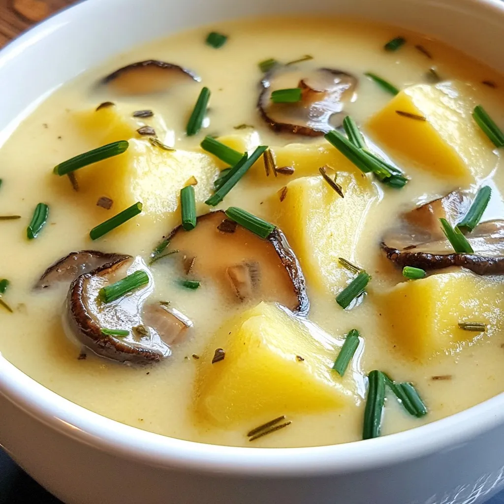 A creamy and comforting soup featuring shiitake mushrooms and potatoes, perfect for a cozy meal.