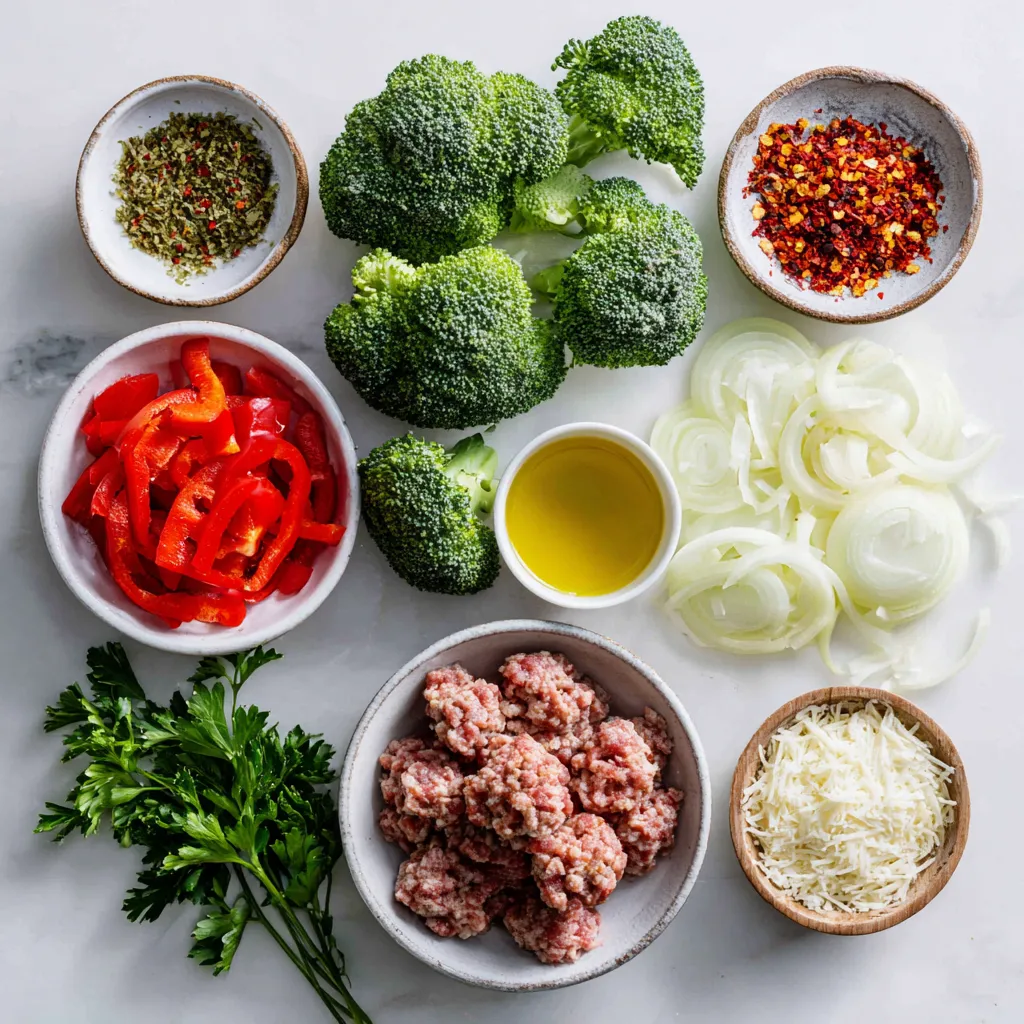 The main ingredients for this dish are simple and fresh. You need Italian sausage, which brings great flavor. You can pick either mild or spicy sausage based on your taste. Fresh broccoli adds a nice crunch and bright color. The onion and garlic bring a sweet and savory taste, while the red bell pepper adds a hint of sweetness.