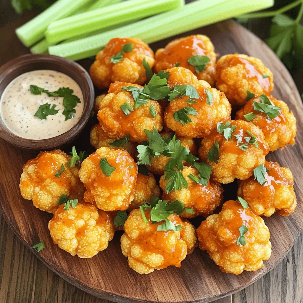 - 1 large head of cauliflower, cut into florets - 1 cup all-purpose flour - 1 teaspoon garlic powder - 1 teaspoon onion powder - 1 teaspoon smoked paprika - 1 teaspoon cayenne pepper (adjust for desired spiciness) - 1 cup cold water or non-dairy milk - 1 cup buffalo hot sauce (adjust to taste) - 2 tablespoons melted vegan butter or regular butter - Salt and pepper, to taste - Fresh parsley, finely chopped for garnish I love how each ingredient plays a role in the flavor and texture of these bites. The cauliflower gives a nice crunch. The flour and spices create a flavorful coating. Adding garlic and onion powder brings depth. Smoked paprika adds a bit of warmth, while cayenne gives that kick. I prefer using cold water or non-dairy milk for a creamier batter. The buffalo sauce is the star here. It adds heat and tanginess. Mixing it with melted butter makes it rich and smooth. For the finishing touch, sprinkle fresh parsley on top. It adds color and a fresh taste. Each ingredient is simple but works together to make something truly special. First, preheat your oven to 450°F (232°C). This helps get the cauliflower crispy. Next, prepare a baking sheet by lining it with parchment paper. This will keep the bites from sticking. Now, let’s mix the batter. In a large bowl, combine 1 cup of all-purpose flour, 1 teaspoon of garlic powder, 1 teaspoon of onion powder, 1 teaspoon of smoked paprika, and 1 teaspoon of cayenne pepper. Add a pinch of salt and pepper too. Whisk these dry ingredients together until blended. Slowly pour in 1 cup of cold water or non-dairy milk. Stir until you get a smooth batter. The batter should be pourable but thick enough to coat the cauliflower. Next, take each cauliflower floret and dip it into the batter. Make sure each piece is fully coated. Place the battered florets onto the lined baking sheet in a single layer. Bake in the preheated oven for 20-25 minutes. You want them to turn a nice golden brown and become crispy. Keep an eye on them, as oven times can vary. While the cauliflower bakes, prepare the buffalo sauce. In a small bowl, mix 1 cup of buffalo hot sauce with 2 tablespoons of melted butter. Stir until well combined. Once the cauliflower is crisp and golden, take it out of the oven. Drizzle the buffalo sauce over the florets or toss them gently in a mixing bowl with the sauce for even coating. Return the cauliflower bites to the oven for an additional 5-10 minutes. This helps the sauce stick and boosts the flavor. After this time, take them out and let them cool slightly before serving. To make your Buffalo Cauliflower Bites pop with flavor, you can easily adjust the spice levels. If you like heat, add more cayenne pepper to the batter or sauce. For a milder bite, use less cayenne and choose a milder hot sauce. You can also mix in some garlic or onion powder for a deeper flavor. For a crispier texture, make sure your cauliflower florets are well-coated in the batter. Let any excess batter drip off before placing them on the baking sheet. This helps prevent sogginess. You can also bake them a bit longer, but keep an eye on them to avoid burning. You can choose between the oven and air fryer to cook your cauliflower bites. Both methods give great results, but they differ in texture. The oven gives a nice even crisp, while the air fryer can make them even crunchier. If using the oven, preheat to 450°F (232°C) for the best results. Baking time is important. Bake your bites for 20-25 minutes until they turn golden brown. If you use the air fryer, check them at about 15 minutes. Adjust the baking time based on how crispy you want them. Always make sure to check for doneness to keep them from getting too soft. {{image_4}} For a gluten-free option, you can use gluten-free flour. It works great in the batter. Just replace the all-purpose flour with an equal amount of gluten-free flour. If you need a dairy-free alternative for the sauce, use vegan butter instead of regular butter. This keeps the flavors rich without the dairy. You can also use a store-bought vegan hot sauce if you prefer. Try adding different seasonings to the batter. A pinch of cumin or a sprinkle of Italian herbs can add a new twist. If you like heat, add more cayenne pepper or even some chili powder. For serving, pair the Buffalo Cauliflower Bites with various dips. Ranch or blue cheese dressing is classic. But you can also serve them with a zesty avocado dip or a cool yogurt sauce. These options add extra flavor and fun to your snack! To keep your Buffalo Cauliflower Bites fresh, store them in an airtight container. Place the container in the fridge. They stay good for about 3-5 days. When you want to eat them again, reheating is key. To reheat, use an oven or an air fryer. Preheat the oven to 350°F (175°C). Place the bites on a baking sheet and heat for 10-15 minutes. This will help them stay crispy. You can freeze these bites either before or after cooking. If you freeze them before cooking, coat the florets in batter. Arrange them on a baking sheet and freeze until firm. Then, transfer the bites into a freezer bag. If you freeze them after cooking, let them cool first. Then, place them in a freezer bag. They last up to 3 months. When you're ready to eat, thaw the bites in the fridge overnight. For reheating, bake them in a preheated oven at 400°F (200°C) for about 15-20 minutes. This keeps them crispy and tasty. Can I make Buffalo Cauliflower Bites ahead of time? Yes, you can prepare the cauliflower bites in advance. Just coat them with the batter and place them on the baking sheet. You can store them in the fridge for a few hours. When you're ready, bake them as directed. This makes a quick snack for parties or game days. What can I serve with Buffalo Cauliflower Bites? These bites pair well with several sides. I love serving them with celery sticks. You can also add ranch or blue cheese dressing for dipping. They make a great snack for any occasion. How do I make them spicier or mi