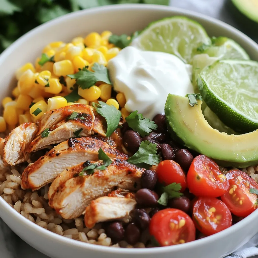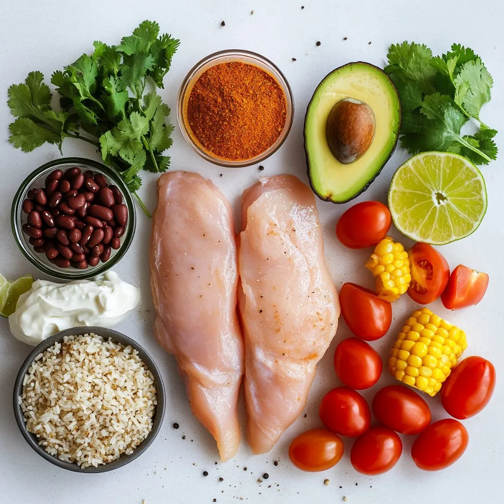 The main ingredients create a hearty base for your burrito bowls. The chicken gives protein. Rice or quinoa adds grains. Black beans and corn bring fiber and flavor. Fresh vegetables make the dish colorful and bright.