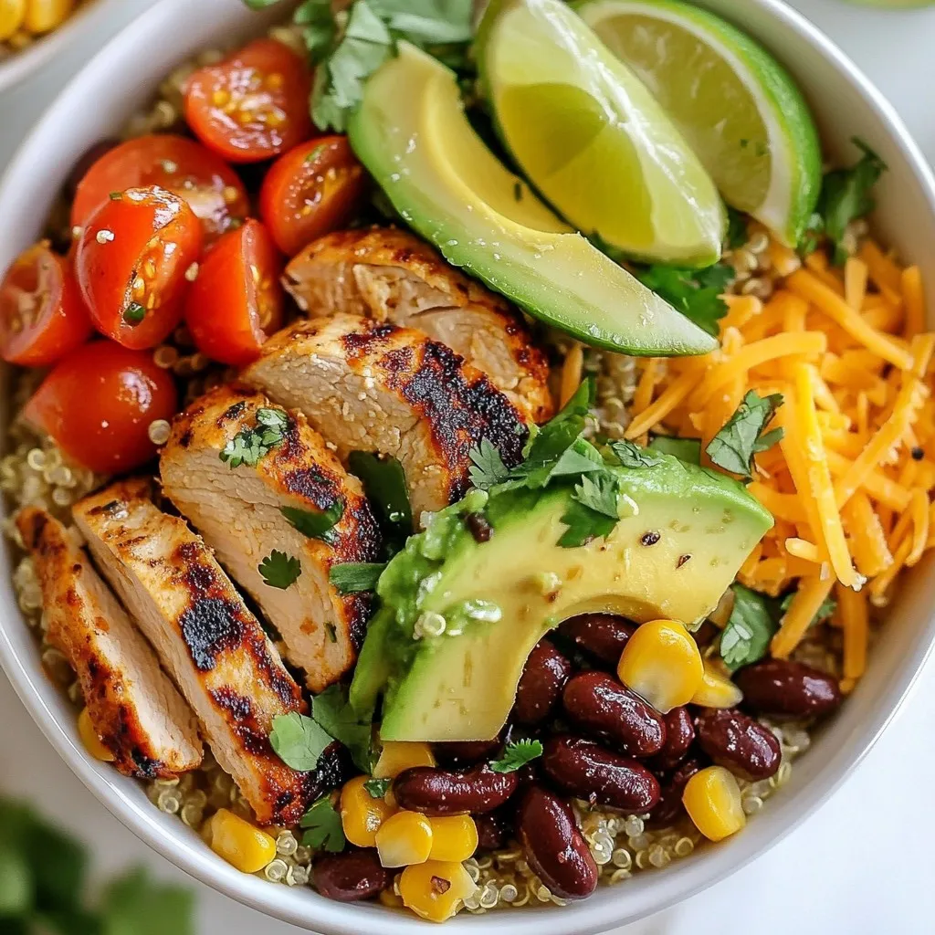 To make your burrito bowls look great, layer the ingredients. Start with quinoa or rice at the bottom. Then, add the chicken on top. Next, place the avocado slices and cheese. Finally, sprinkle cilantro over everything. Serve with lime wedges and salsa on the side for color and flavor. A colorful napkin adds a fun touch to the meal.