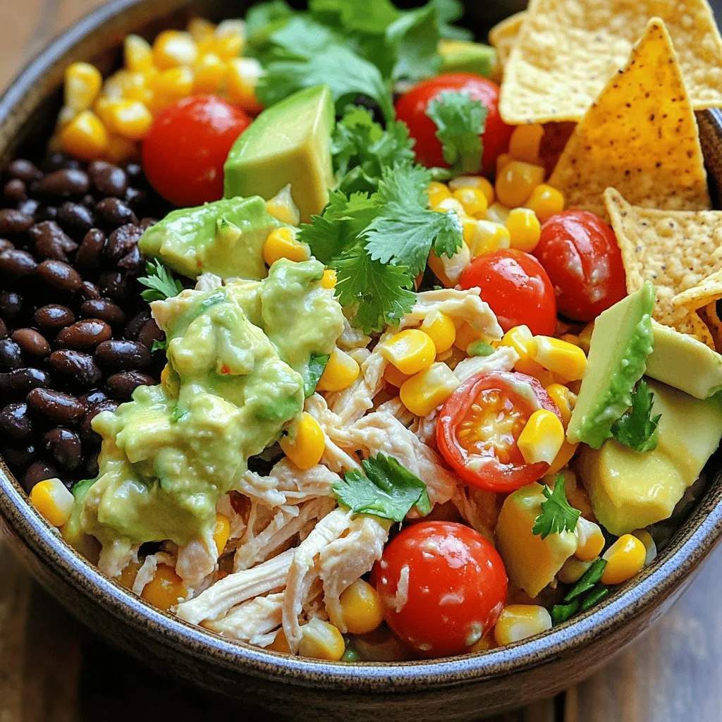 The main ingredients bring a hearty base to the salad. I love using shredded chicken, black beans, and corn. They add protein and texture. The fresh vegetables and herbs give the salad a vibrant look. The red bell pepper and avocado add crunch and creaminess. Cherry tomatoes bring sweetness, while cilantro adds a fresh kick.