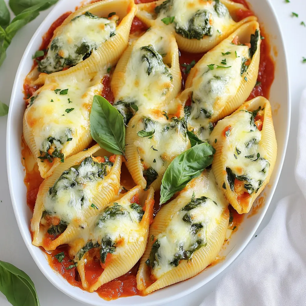 After baking, let the dish rest for a few minutes. This helps the flavors settle. To finish, add fresh basil leaves on top for a pop of color and flavor. Now, it’s time to serve and enjoy your savory spinach ricotta stuffed shells!