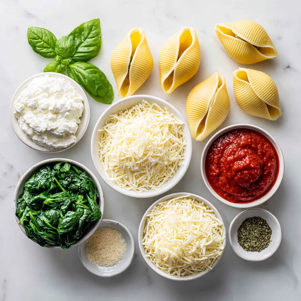 To make the best spinach ricotta stuffed shells, gather these main ingredients. You need jumbo pasta shells for a hearty base. Ricotta cheese gives a creamy texture. Fresh spinach adds color and flavor. Mozzarella and Parmesan cheeses bring richness and a nice crust when baked.