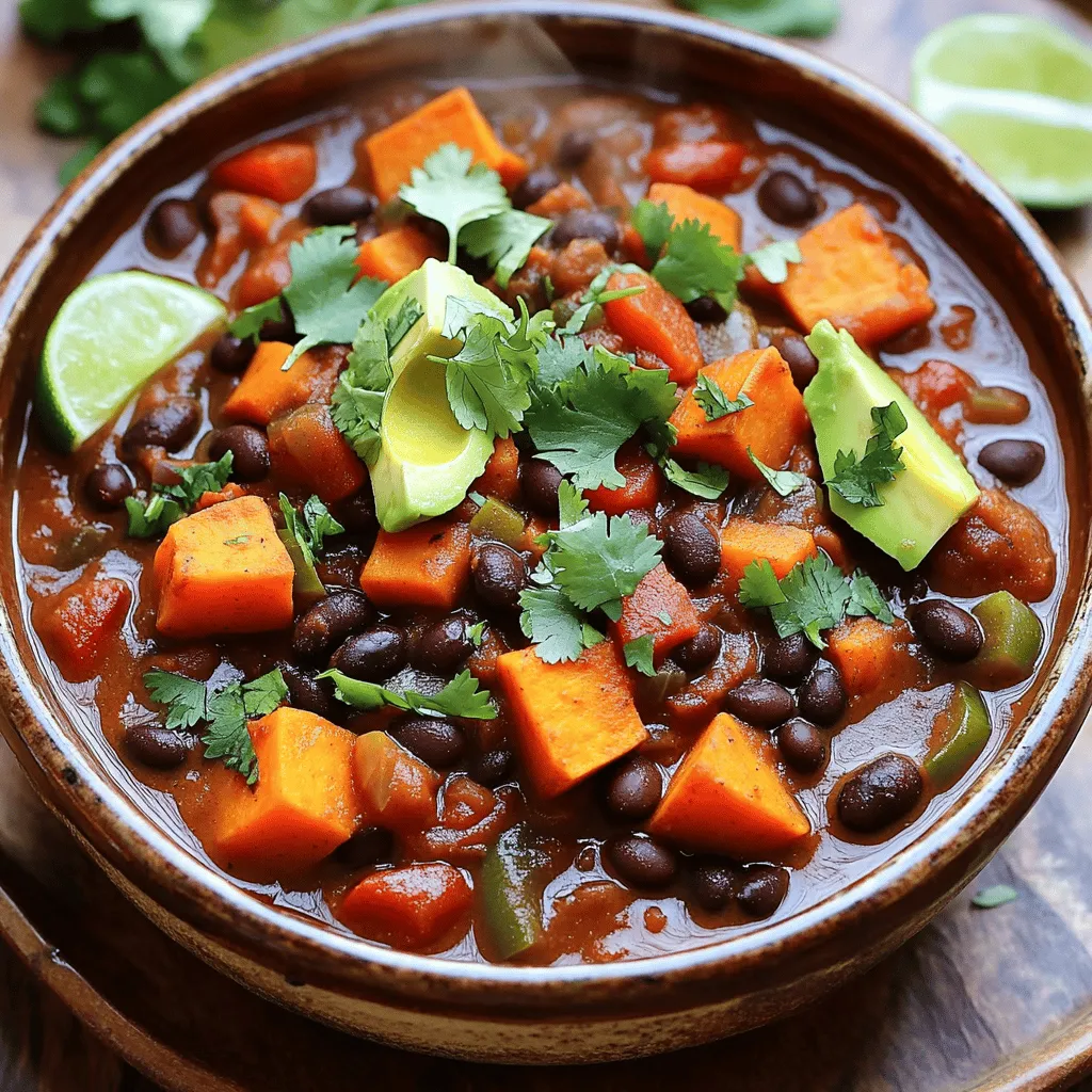 ![To make a hearty Sweet Potato Black Bean Chili, you will need: - 2 medium sweet potatoes, peeled and cut into ½-inch cubes - 1 can (15 oz) black beans, thoroughly drained and rinsed - 1 large onion, finely diced - 2 cloves garlic, finely minced - 1 red bell pepper, chopped into small pieces - 1 can (14.5 oz) diced tomatoes with their juices - 2 cups vegetable broth (preferably low-sodium) - 1 tablespoon chili powder - 1 teaspoon ground cumin - 1 teaspoon smoked paprika - ½ teaspoon cayenne pepper (adjust according to your spice preference) - Sea salt and freshly cracked black pepper, to taste - 2 tablespoons olive oil Adding toppings can enhance the chili's flavor and look. Here are some tasty options: - Diced avocado for creaminess - Fresh cilantro leaves for a pop of color - Lime wedges for a zesty touch Each ingredient brings unique health benefits: - Sweet potatoes are rich in vitamins A and C. They provide fiber and antioxidants. - Black beans are a great source of protein and fiber. They help keep you full longer. - Onions contain antioxidants and may help reduce inflammation. - Garlic has immune-boosting properties and adds flavor. - Bell peppers are high in vitamin C and help with skin health. This chili is not just filling; it also packs a nutritious punch, making it a well-rounded meal for any day. For the full recipe, check out the recipe section above. Start with a large pot. Heat 2 tablespoons of olive oil over medium heat. Wait until the oil shimmers. Add 1 finely diced onion and 1 chopped red bell pepper. Sauté for about 5 minutes. Stir often until the onion is soft and clear. Next, add 2 minced garlic cloves. Sauté for 1 more minute, just enough to let the garlic smell good. Now, it’s time for the sweet potatoes. Add 2 medium sweet potatoes, cut into ½-inch cubes. Sprinkle in 1 tablespoon chili powder, 1 teaspoon ground cumin, 1 teaspoon smoked paprika, and ½ teaspoon cayenne pepper. Don’t forget salt and pepper to taste! Stir well to coat the sweet potatoes in the spices. Pour in 1 can of diced tomatoes with juices and 2 cups of vegetable broth. Mix everything together and bring it to a boil. Once boiling, lower the heat. Cover the pot and let the chili simmer for 25 to 30 minutes. The sweet potatoes should be soft but not mushy when you poke them with a fork. After the sweet potatoes cook, stir in 1 can of black beans, drained and rinsed. Heat through for another 5 minutes. This gives the beans time to warm up. Taste the chili and add more salt or pepper if you want. - Sauté onion and bell pepper: 5 minutes - Sauté garlic: 1 minute - Simmer chili: 25 to 30 minutes - Heat black beans: 5 minutes - Cut sweet potatoes into even pieces for uniform cooking. - Stir the chili occasionally to prevent sticking. - Adjust the spice levels based on your taste. - Let the chili sit for a few minutes before serving; this helps the flavors blend. For the full recipe, check out [Full Recipe]. Enjoy creating this hearty dish! Many people rush the cooking. Take your time to sauté the onion and pepper. This step builds flavor. If you skip it, your chili may taste flat. Another mistake is adding too much spice at once. Start small, then adjust to your taste. Remember to drain the black beans well. This avoids a watery chili. Use fresh herbs like cilantro or parsley for a burst of freshness. A squeeze of lime juice adds brightness. You can also try adding a splash of soy sauce for depth. If you want more heat, add diced jalapeños or a dash of hot sauce. Lastly, consider a drizzle of olive oil before serving. This adds richness and a nice finish. For this chili, you need a sturdy large pot. A good pot helps with even cooking. A sharp knife and cutting board make prep easy. You also need measuring spoons for spices and a can opener for the beans and tomatoes. A wooden spoon works best for stirring. Having these tools ready will make your cooking smooth and fun. For the full recipe, refer back to the main article. {{image_4}} You can switch up beans in this chili. Try using kidney beans or pinto beans. Both add a different flavor and texture. If you want a creamier chili, use cannellini beans. Mixing beans can make your dish more fun and unique. Feel free to add more veggies. Corn adds sweetness and crunch. Zucchini or carrots can boost nutrition and color. For a protein boost, add cooked quinoa or lentils. You can even throw in some chopped kale or spinach for added greens. These additions can change your chili into a new dish each time. Want more heat? Add extra cayenne pepper or diced jalapeños. For a milder taste, reduce the cayenne or skip it altogether. You can also add a dash of hot sauce when serving for those who like it spicy. If you love smoky flavors, try adding chipotle peppers in adobo sauce. Adjust the spices to fit your taste and make it your own. For the full recipe, check out the Sweet Potato Black Bean Chili section above. To keep your Sweet Potato Black Bean Chili fresh, let it cool first. Once cool, transfer it to an airtight container. It’s best to refrigerate the chili within two hours of cooking. When stored correctly, it lasts in the fridge for about 4 to 5 days. Be sure to label the container with the date. This helps you track how long it has been stored. If you want to keep your chili for a longer time, consider freezing it. First, let the chili cool completely. Then, pour it into freezer-safe bags or containers. Make sure to leave some space for expansion. Seal them tightly to prevent freezer burn. You can freeze the chili for up to 3 months. When you’re ready to enjoy it, just thaw it overnight in the fridge. To reheat your chili, you have a few options. The microwave is quick, but it can heat unevenly. Stir the chili halfway through heating. For the stove, pour the chili into a pot and heat it over medium heat. Stir often until it’s hot. This method helps maintain flavor and texture. If it seems thick, add a splash of vegetable broth or water