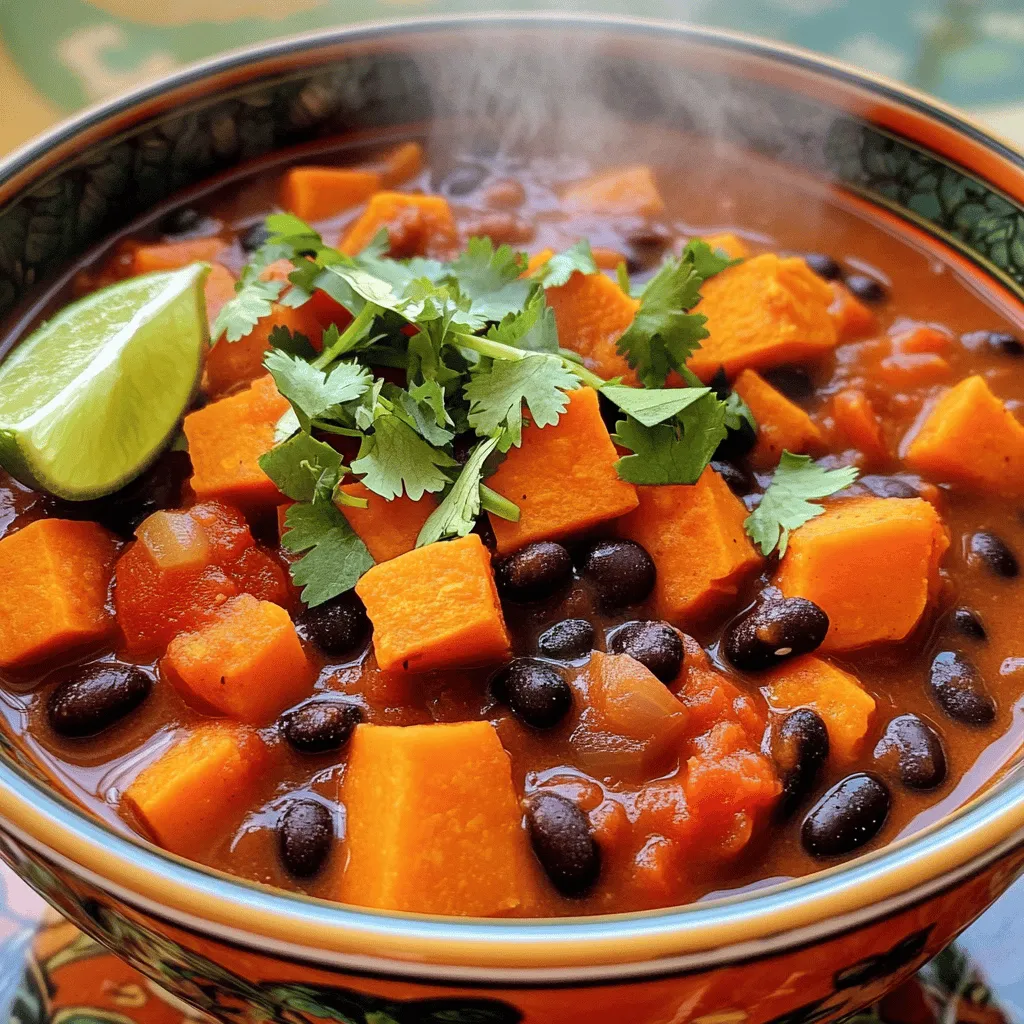 ![To make this savory sweet potato black bean chili, gather these main ingredients: - 2 medium sweet potatoes, peeled and cut into 1-inch cubes - 1 can (15 oz) black beans, thoroughly rinsed and drained - 1 can (14.5 oz) diced tomatoes - 1 medium onion, finely chopped - 2 cloves garlic, finely minced - 1 bell pepper, diced - 1 cup vegetable broth - 2 teaspoons ground cumin - 1 teaspoon smoked paprika - 1 teaspoon chili powder - ½ teaspoon dried oregano - Salt and freshly cracked pepper to taste - 2 tablespoons extra virgin olive oil - Fresh cilantro, chopped, for garnish - Lime wedges, for serving If you want to take your chili to the next level, you can add some optional ingredients: - 1-2 jalapeños, diced for heat - 1 cup corn, for sweetness and crunch - 1 teaspoon cayenne pepper, for extra spice - 1 tablespoon apple cider vinegar, to brighten flavors This chili is not just tasty; it’s also packed with nutrition. Here’s a quick breakdown: - Calories: About 250 per serving - Protein: 10 grams - Fat: 7 grams - Carbohydrates: 45 grams - Fiber: 12 grams - Sugars: 5 grams This dish is rich in fiber and protein, making it a filling meal. It also provides a good source of vitamins A and C from the sweet potatoes and peppers. For the full recipe, check out the provided link! Start by gathering your ingredients. You need sweet potatoes, black beans, diced tomatoes, onion, garlic, bell pepper, vegetable broth, spices, olive oil, salt, and pepper. Make sure to peel and cube the sweet potatoes into 1-inch pieces. Rinse the black beans well and drain them. Chop the onion and garlic finely. Dice the bell pepper. This will set you up for success! Heat olive oil in a large pot over medium heat. Add the chopped onion and bell pepper. Sauté them for about 5 minutes until they are soft. Then, add the minced garlic. Stir for 1 minute until you smell its great aroma. Next, add the sweet potatoes, diced tomatoes, and vegetable broth. Sprinkle in cumin, smoked paprika, chili powder, oregano, and season with salt and pepper. Mix everything together. Bring the mix to a gentle boil, then lower the heat. Cover the pot and let it simmer for 25-30 minutes. The sweet potatoes should be tender and easy to fork. Finally, fold in the black beans and let them warm for about 5 minutes. Taste it and adjust the seasoning if you want. Serve the chili hot in vibrant bowls. Top each bowl with fresh cilantro and a lime wedge. The lime adds a nice burst of flavor. For more richness, you can add a dollop of avocado or sour cream. This chili tastes great and looks beautiful on the table. For the full recipe, check out the [Full Recipe] link! To boost flavors in your sweet potato black bean chili, use a few easy tricks. Start by sautéing your onions and peppers in olive oil. This step builds a solid flavor base. Make sure they soften and release their natural sugars. Next, add garlic for aroma, stirring it briefly. This brings out the richness in your chili. Using smoked paprika adds depth. It gives a subtle, smoky taste that lifts the dish. Always taste as you go. Adjusting the seasoning lets you find the perfect balance. Many people rush when cooking chili. Give your sweet potatoes enough time to soften. If they are still hard, your chili will not taste great. Another mistake is ignoring the beans. Be sure to fold them in gently so they don’t break apart. Also, don’t skip the lime! It brightens the flavors. Lastly, avoid overcooking the chili. A gentle simmer is enough to meld the flavors without losing texture. If you like heat, there are simple ways to spice things up. Start with mild chili powder, then add cayenne or hot sauce for more warmth. You can also use diced jalapeños for a fresh kick. For less heat, choose milder peppers and skip the extra spices. Always taste before serving. This way, you can adjust the spice level to suit everyone’s palate. {{image_4}} This chili is already vegetarian and vegan. You can enhance it by adding more veggies. Try using zucchini, corn, or mushrooms. These add texture and flavor. You can also swap the vegetable broth for a homemade version. Just boil water with herbs and spices to boost taste. This chili is gluten-free as is. If you want, you can add gluten-free grains. Quinoa or brown rice make great additions. Cook them separately and mix them in before serving. This will give you a hearty meal without gluten. You can make this chili your own with fun add-ins. Try adding fresh spinach or kale for extra greens. A splash of lime juice brightens the flavors. For a smoky kick, add chipotle peppers in adobo sauce. You can also top it with avocado, cheese, or yogurt. These toppings add creaminess and contrast. Check out the Full Recipe for more ideas! To keep your sweet potato black bean chili fresh, first, let it cool down. Then, pour it into an airtight container. This helps prevent spills and keeps the flavor locked in. You can store it in the fridge for up to three days. Make sure to label the container with the date for easy tracking. If you want to save your chili for later, freezing is a great option. Use freezer-safe bags or containers. Pour the chili into the bags, leaving some space for expansion. Seal them tightly to avoid freezer burn. You can freeze your chili for up to three months. Remember to label the bags with the date so you know when to use them. When you're ready to enjoy your chili again, there are a few ways to reheat it. The best method is to use a pot on the stove. Heat it over medium-low heat, stirring often until it's hot. If you prefer the microwave, pour the chili into a microwave-safe bowl. Cover it loosely and heat for 2-3 minutes, stirring halfway through. Always check that it’s hot all the way through before serving. For added flavor, squeeze some fresh lime juice on top before you dig in! If you do not have sweet potatoes, you can use butternut squash or regular potatoes. Both options will add a nice texture and flavor to the chili. You may 