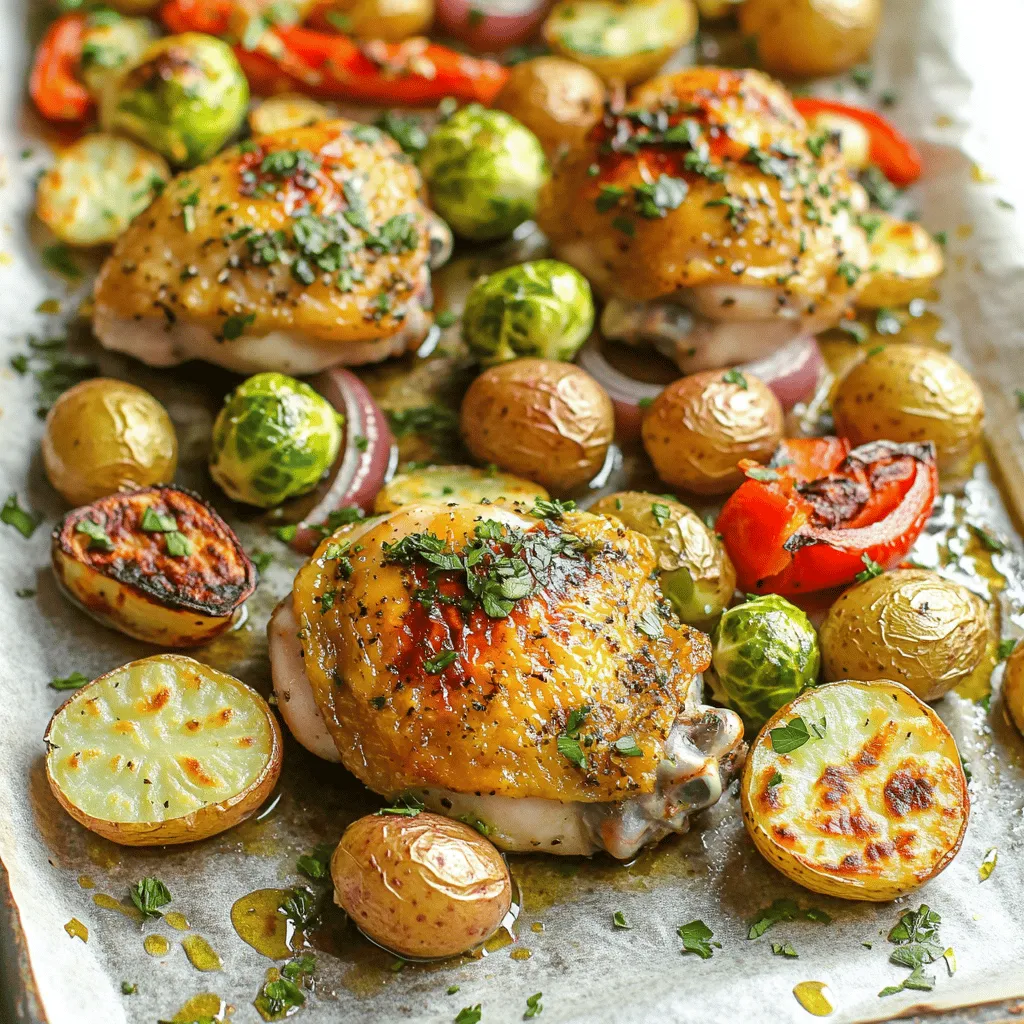 If you don’t have chicken thighs, use bone-in breasts. They work fine too. Swap baby potatoes for sweet potatoes or carrots. Brussels sprouts can be replaced with green beans. For garlic, try garlic powder if you are in a pinch. Adjust seasonings to what you enjoy best.