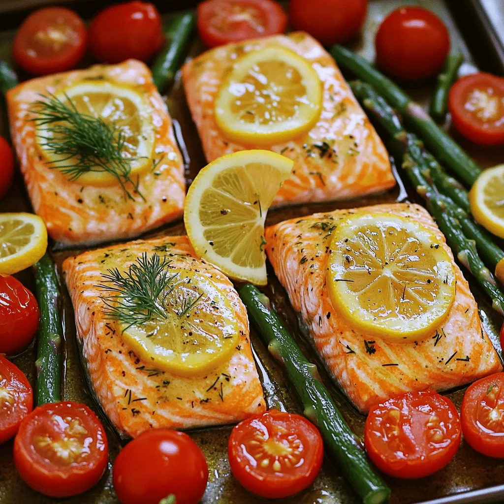 . - Preheat the oven to 400°F (200°C). - Line the sheet pan with parchment paper. - Whisk together olive oil, garlic, lemon juice, lemon zest, dill, salt, and pepper. - This mix adds flavor and moisture to your salmon. - Coat salmon fillets with the marinade. - Arrange cherry tomatoes and asparagus on the sheet pan. - Make sure the veggies are spread out for even cooking. - Transfer the pan to the oven and bake for 15-20 minutes. - The salmon will be done when it flakes easily with a fork. - Check that the asparagus is tender but still crisp. - Let the dish rest for a few minutes before serving. - Garnish with lemon slices and optional dill for a fresh look. I love how easy this dish is to prepare. You can find the Full Recipe for more details. To ensure salmon is perfectly cooked, use a fork to test it. When it flakes easily, it’s done. Aim for an internal temperature of 145°F. This way, your salmon will be moist and tender. Resting time is key after cooking. Let the salmon sit for about 5 minutes before serving. This helps the juices redistribute, making each bite more flavorful. Serving directly from the pan gives a cozy feel. It makes the meal feel more relaxed and invites everyone to dig in. For plating, use a large plate. Place a salmon fillet in the center. Arrange the asparagus and tomatoes around it. A touch of fresh dill on top adds color and flavor. To boost flavor, consider adding spices like paprika or smoked sea salt. Fresh herbs like basil or parsley can also work well. For marinades, try mixing honey with soy sauce for a sweet twist. You can also use a splash of white wine to elevate the dish. For the full recipe, check the links above. {{image_4}} You can easily swap salmon for other fish like trout or cod. These fish cook similarly and absorb flavors well. If you want a different protein, try chicken breasts. They work great too. For vegetarian or vegan options, use tofu or tempeh. Both can soak up the lemon garlic marinade and bring great taste. Using seasonal vegetables can brighten your dish. In spring, try green beans or baby carrots. Summer is perfect for zucchini or bell peppers. In fall, consider sweet potatoes or Brussels sprouts. Winter brings root vegetables like parsnips and turnips. If you want to switch out asparagus or tomatoes, don't hesitate. Broccoli or cauliflower can add nice crunch and flavor. Experimenting with herbs and spices opens new doors. Try fresh basil or parsley for a bright twist. If you want a bolder taste, use smoked paprika or cumin. You can also play with sweet and savory. Adding fruits like pineapple or peaches can bring a fun contrast to the dish. Mixing flavors can create a memorable meal! For the full recipe, check out the [Full Recipe]. Store any leftover salmon and veggies in the fridge. Use airtight containers to keep them fresh. Make sure the lid fits tightly. This helps maintain flavor and texture. It's best to eat leftovers within two days for the best taste. To reheat salmon, use low heat to avoid drying it out. You can use the oven or microwave. For the oven, set it to 350°F (175°C) and warm for about 10 minutes. If using the microwave, place salmon on a plate and cover it with a damp paper towel. Heat in short bursts of 30 seconds until warmed through. You can freeze cooked salmon and veggies for later. Wrap each piece tightly in plastic wrap, then place in a freezer bag. Be sure to remove as much air as possible. For thawing, move them to the fridge for a few hours or overnight. This keeps the salmon tasty and moist. How long to bake salmon at different temperatures? For salmon, the general rule is to bake it at 400°F for 15-20 minutes. If you choose 375°F, it may take 20-25 minutes. At 425°F, check it after 12-15 minutes. Cooking time varies with thickness and oven accuracy. Always check for doneness to avoid overcooking. Can I use frozen salmon for this recipe? Yes, you can use frozen salmon. Just be sure to thaw it first. Place it in the fridge overnight or use cold water for quicker thawing. Pat the salmon dry before adding the marinade. This helps it absorb the flavors better. What temperature should salmon be cooked to? Salmon should reach an internal temperature of 145°F. Use a meat thermometer to check. When done, it should flake easily with a fork. The color will change from bright pink to opaque. How can I tell when the salmon is done? You can tell salmon is ready when it flakes easily. Press it gently with a fork. If it breaks apart, it's done. The color should be a light pink with a slightly opaque appearance. What sides pair well with lemon garlic salmon? Great sides include rice, quinoa, or a fresh salad. Roasted potatoes or steamed veggies also work well. These sides complement the salmon's bright flavors. You might want to add a squeeze of lemon on top. Is it okay to substitute any ingredients? Yes, you can substitute ingredients. Use any firm fish if you don't have salmon. For veggies, try broccoli or zucchini. You can swap fresh herbs with dried ones, but use less. Adjust the flavors to suit your taste! For the complete recipe, check out the Full Recipe section. This blog post showed you how to make a delicious lemon garlic salmon dish. We covered the main ingredients, easy steps for cooking, and tips for great results. You learned about variations and storing leftovers for later. Cooking should be fun, and this recipe is simple and tasty. Try it out and enjoy your meal. Once you master this dish, feel free to experiment with your own flavors and sides. Happy cooking!](https://joymealplan.com/wp-content/uploads/2025/07/8e928ca0-d1e7-48e9-9001-0d995acac6dc-300x300.webp)