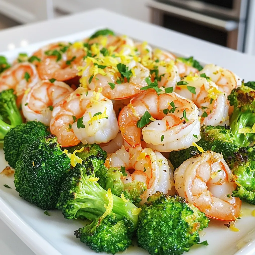 - 1 lb large shrimp, peeled and deveined - 4 cups fresh broccoli florets - 4 cloves garlic, finely minced - 3 tablespoons extra-virgin olive oil For this dish, I love using large shrimp. They soak up the lemon and garlic flavors well. Fresh broccoli florets add both color and crunch. Minced garlic brings a strong, savory taste that pairs perfectly with shrimp. The olive oil helps everything cook evenly while adding a nice richness. - Juice and zest of 1 fresh lemon - 1 teaspoon smoked paprika - 1 teaspoon dried oregano - Salt and freshly cracked black pepper The lemon juice and zest give this dish a bright, zesty flavor. Smoked paprika adds a touch of smokiness that enhances the shrimp. Dried oregano brings an earthy note. Don't forget salt and pepper to taste; they help everything shine. - Fresh parsley, finely chopped Chopped parsley not only looks good but also adds a fresh flavor. It’s great to sprinkle on top just before serving. This small touch makes your dish pop! - Preheat oven to 400°F (200°C). - Line a baking sheet with parchment paper. Start by getting your oven nice and hot. Parchment paper makes cleanup easy. It also helps the shrimp and broccoli cook evenly. - Mix shrimp, broccoli, and garlic in a bowl. - Add olive oil, lemon juice, and seasonings. In a large bowl, toss together the shrimp, fresh broccoli, and minced garlic. Next, drizzle in the extra-virgin olive oil. Squeeze in the lemon juice and add the lemon zest. Add the smoked paprika, oregano, salt, and black pepper. Make sure everything is well mixed. Each piece should be coated with flavor. - Spread the mixture on the baking sheet. - Bake for 12-15 minutes and garnish with parsley. Now, spread the shrimp and broccoli on the lined baking sheet. Try to keep them in a single layer for the best cooking. Place the sheet in the oven and bake for 12 to 15 minutes. The shrimp will turn pink and opaque, while the broccoli will get tender and a bit crispy. When it’s done, sprinkle fresh parsley on top for a burst of color and flavor. To ensure even cooking and caramelization, spread the shrimp and broccoli in a single layer. Avoid crowding the pan. This allows the heat to circulate well. Cook them at 400°F for 12-15 minutes. Look for shrimp that turns pink and opaque. Broccoli should be tender with crispy edges. Pair this dish with fluffy jasmine rice or crusty bread. Rice absorbs the tasty lemon-garlic sauce. The bread is perfect for sopping up any remaining sauce. For a beautiful touch, sprinkle fresh parsley on top. You can also add lemon wedges for extra zesty flavor. Use a rimmed baking sheet for this recipe. It helps contain any juices from the shrimp. A good-quality sheet pan promotes even heat distribution. For prep, use a large mixing bowl to combine all ingredients. A spatula works great for tossing everything together. {{image_4}} You can easily swap out the broccoli for other veggies. Try bell peppers, asparagus, or snap peas. These veggies can add color and crunch. If you want to use different proteins, chicken or firm tofu work great too. Just adjust the cooking time based on the protein you choose. To add some heat, sprinkle red pepper flakes over the dish. This small change can make a big impact. You may also try mixing different herbs like thyme or basil for a fresh twist. Using a blend of your favorite spices can create a unique flavor profile. This dish can become more than just a meal. You can turn it into a tasty salad. Add mixed greens and a light dressing for a fresh option. Alternatively, place the shrimp and broccoli over cooked pasta. This creates a hearty and satisfying dish that everyone will love. Store leftovers in an airtight container. This keeps them fresh and tasty. You can keep the shrimp and broccoli in the fridge for up to three days. Just make sure to let it cool down before sealing. To freeze, place the cooled dish in a freezer-safe container. Leave some space at the top for expansion. You can freeze it for up to three months. When ready to eat, thaw it in the fridge overnight. To reheat, simply warm it in the oven or microwave until hot. You can prepare portions ahead of time. Divide the shrimp and broccoli into meal-sized containers. This makes it easy to grab and go. For best results, keep the shrimp and broccoli separate from rice or bread until ready to eat. This keeps everything fresh and delicious. You can tell shrimp are cooked by their color and texture. Look for a bright pink color. The shrimp will also become opaque. If they curl into a C shape, that's a good sign too. Cook them for about 12-15 minutes. Overcooking can make them tough, so keep an eye on them. Yes, you can use frozen shrimp. Just thaw them before cooking. Place the shrimp in a bowl of cold water for about 15-20 minutes. Once thawed, peel and devein them if needed. This will help them cook evenly. If you use frozen shrimp, reduce the cooking time by a minute or two. Lemon garlic shrimp pairs well with several side dishes. Here are some ideas: - Fluffy jasmine rice - Crusty bread for dipping - A fresh green salad - Quinoa with herbs These options will balance the flavors and make your meal complete. You learned how to make a simple and tasty lemon garlic shrimp dish. We covered the main ingredients, step-by-step instructions, and cooking tips. You can customize the recipe with variations and creative serving ideas. Storing leftovers and meal prep tips help you enjoy this meal later. Now, try making it your own. Enjoy a delicious meal that brings flavor and ease to your table. Your kitchen adventures are just beginning!