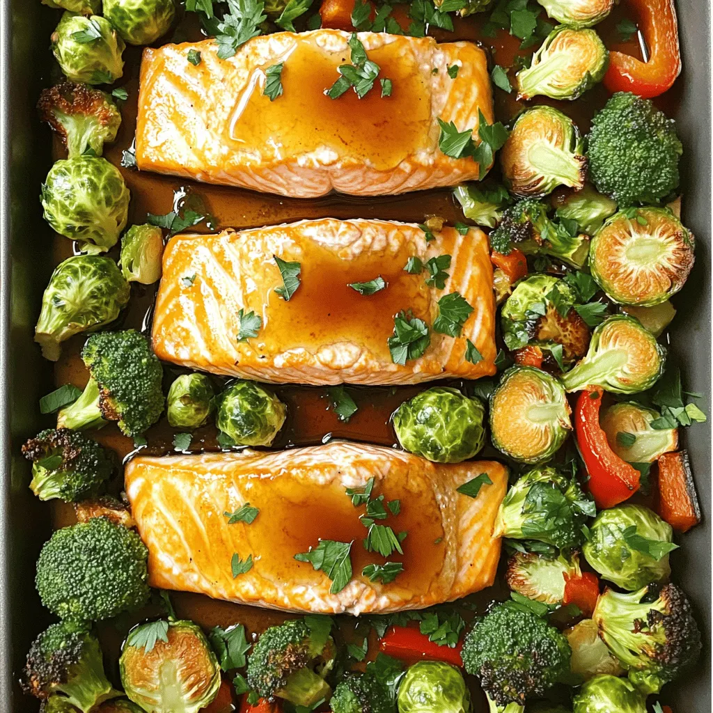 Having the right ingredients makes all the difference in this dish. I love using skin-on salmon fillets. The skin adds lots of flavor and keeps the fish moist while cooking. For veggies, I choose Brussels sprouts, broccoli, and red bell pepper. These colorful veggies roast well and add great texture.