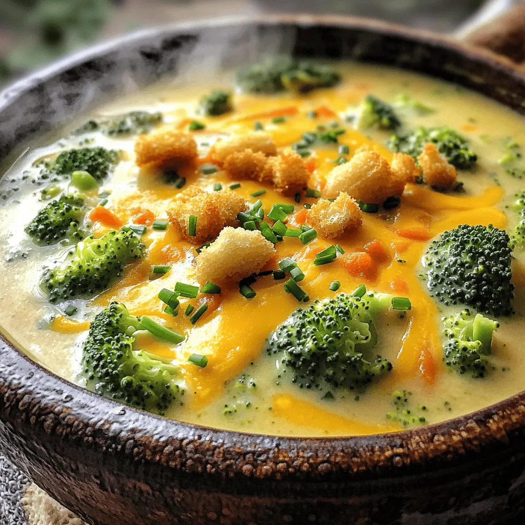 Ladle the soup into bowls. For a special touch, top with croutons and chopped chives. This adds color and texture. Enjoy your creamy broccoli cheddar soup with warm bread or a side salad.