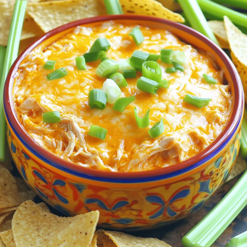 - 2 cups shredded cooked chicken - 1 cup cream cheese, softened - 1 cup buffalo sauce - 1 cup shredded sharp cheddar cheese - 1/2 cup ranch dressing - 1/2 cup fresh green onions, chopped - 1 teaspoon garlic powder - Salt and pepper to taste The main ingredients for this dip are simple yet bold. I love using shredded cooked chicken, like rotisserie chicken, because it saves time. Cream cheese creates a rich texture. Buffalo sauce brings the heat, so adjust it based on your spice level. For a touch of creaminess, ranch dressing pairs well with the buffalo sauce. Don't forget the fresh green onions; they add a nice crunch and flavor. - Alternative chicken options: You can use canned chicken or leftover chicken. - Cream cheese alternatives: Try Greek yogurt or dairy-free cream cheese for a lighter dip. - Adjusting spice levels in buffalo sauce: If you like it less spicy, mix in some sour cream or use mild buffalo sauce. These substitutions can help you create a dip that suits your taste and dietary needs. Feel free to experiment, and always make it your own! To start, prepare your slow cooker. Make sure it is clean and ready to use. This step is key for a smooth cooking process. Next, soften the cream cheese. You can do this by leaving it out at room temperature for about 30 minutes. If you are short on time, cut it into small cubes. This will help it soften faster when mixed. Now, it’s time to combine the ingredients. In the slow cooker, add the shredded chicken and the softened cream cheese. Mix these two until well blended. Then, pour in the buffalo sauce, ranch dressing, and garlic powder. Add a pinch of salt and pepper. Use a spatula to blend everything until the cream cheese is smooth. Ensure there are no large lumps. Once you have combined the base, evenly sprinkle the shredded sharp cheddar cheese on top. Do not stir it in; just let it sit on top for now. Cover the slow cooker with the lid. Set it to low heat and let it cook for 2 to 3 hours. Stir the dip every 30 minutes. This keeps it from sticking and ensures even heating. After the cooking time, remove the lid. Gently fold the dip to incorporate the melted cheddar cheese. This will give your dip a creamy texture. Finally, stir in the chopped green onions. Don’t forget to save some for garnish. This adds color and freshness to your dish, making it more inviting. Using rotisserie chicken makes this dip quick and easy. It saves time and adds great flavor. Just shred the chicken and mix it in. If you want to cook your chicken, use skinless breasts or thighs. Cook them until they are tender. To avoid a lumpy dip, ensure your cream cheese is soft before mixing. Let it sit at room temperature for about 30 minutes. This way, it blends smoothly. When you combine the ingredients, use a spatula to mix well. Make sure there are no large lumps. Serve this dip with crunchy tortilla chips, fresh celery sticks, and toasted bread slices. These sides add nice textures and flavors. You can also use carrot sticks or pita chips for variety. For a great presentation, choose a colorful bowl. A bright bowl makes the dip pop. Top it with extra chopped green onions for a fresh look. Arrange your accompaniments around the bowl for an inviting display. Common mistakes include overcooking the dip or not mixing well. Stir the dip occasionally while it cooks. This helps maintain smoothness and prevents sticking. To reheat leftovers, use a slow cooker on low. Stir in a splash of buffalo sauce or ranch dressing if it seems thick. You can also microwave it in short bursts. Stir well between intervals to keep it creamy. {{image_4}} You can change the taste of your Buffalo chicken dip easily. Adding different cheeses can give it a new twist. Try using mozzarella for a milder flavor. Or, sprinkle in some blue cheese for a bold kick. Want to spice things up? You can add more buffalo sauce for heat. A dash of cayenne pepper can also boost the flavor. If you love herbs, consider adding dried oregano or thyme. These spices can add depth and make your dip unique. If you need to make this dip gluten-free, use gluten-free ranch dressing. Always check labels, as some sauces have hidden gluten. Most of the other ingredients are already gluten-free, which is great! For vegetarian options, swap out the chicken for chickpeas. They will soak up the flavors well. Use a plant-based cream cheese to keep it creamy. This way, everyone can enjoy a tasty dip! You can turn this dip into a fun buffalo chicken sandwich. Just scoop it onto a bun and add some lettuce. This makes for a messy but delicious meal. Another idea is to make buffalo chicken stuffed peppers. Cut bell peppers in half and fill them with the dip. Bake them until the peppers are soft. This adds color and makes the dish healthier. Enjoy these variations at your next gathering! To store your buffalo chicken dip in the fridge, first let it cool completely. Then, transfer it to an airtight container. This helps keep the dip fresh. You can refrigerate it for up to four days. When you want to enjoy it again, just take it out and let it sit at room temperature for about 30 minutes. If you want to freeze the dip, use a freezer-safe container. Make sure to leave some space at the top since the dip may expand. It’s best to freeze it in portions. This way, you can thaw just what you need. The dip can stay in the freezer for about three months. When you’re ready to use it, move it to the fridge overnight to thaw. To reheat your dip, you have a few options. You can use the microwave, stovetop, or slow cooker. For the microwave, place the dip in a microwave-safe bowl and heat for 1-2 minutes. Stir halfway through for even heating. On the stovetop, heat it in a saucepan over low heat, stirring often. If using the slow cooker, warm it on low for about 30 minutes. Always stir well before serving to make sure it’s creamy again. How long does buffalo chicken dip last in the fridge? Buffalo chicken dip lasts about 3 to 4 days in 