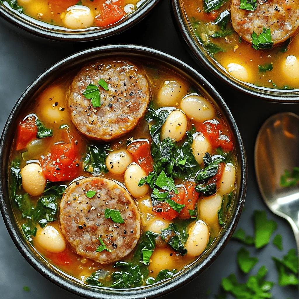 This dish starts with a rich base of sausage. I like to use Italian sausage for its bold flavor. Turkey sausage is a lighter choice but still tasty. Next, I add a can of white beans. Cannellini or great northern beans work best. They add creaminess and protein.
