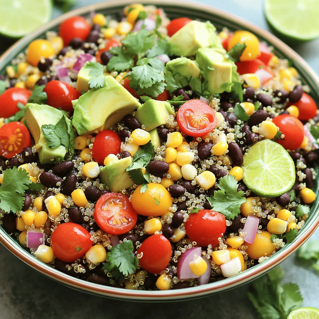 ![- 1 cup quinoa - 2 cups vegetable broth or water - 1 can (15 oz) black beans - 1 cup corn kernels - 1 red bell pepper - 1 cup cherry tomatoes - 1 ripe avocado - 1/4 cup red onion - 1/4 cup fresh cilantro - 1 teaspoon ground cumin - 1 teaspoon chili powder - Juice of 2 fresh limes - 3 tablespoons extra virgin olive oil - Salt and freshly cracked pepper To make a tasty Southwest Quinoa Salad, you need fresh ingredients. Quinoa is the star. It adds protein and fiber. You will also need vegetable broth or water to cook the quinoa. For the beans, I love using black beans. They add creaminess and texture. Corn gives a sweet crunch. You can use fresh or frozen corn. Now, let's talk about fresh produce. The red bell pepper adds color and a slight sweetness. Cherry tomatoes bring juiciness and bright flavor. A ripe avocado gives creaminess. Don't forget the red onion! It adds a nice bite. Finally, fresh cilantro adds a burst of flavor. For spices, cumin and chili powder create a warm, earthy taste. Fresh lime juice adds zest. The olive oil makes the salad rich and smooth. Add salt and pepper to taste. You can find the full recipe for this dish below. 1. Start by rinsing and draining 1 cup of quinoa. This step removes any bitter taste. 2. Next, combine the rinsed quinoa with 2 cups of vegetable broth in a medium-sized saucepan. 3. Set the heat to medium-high and bring it to a boil. 4. Once boiling, reduce the heat to low, cover the pan, and let it simmer for about 15 minutes. 5. After 15 minutes, the quinoa should be fluffy and all the liquid absorbed. Remove it from heat. 6. Let it sit covered for another 5 minutes. Finally, fluff the quinoa gently with a fork and set it aside to cool completely. 1. In a large mixing bowl, add the following ingredients: - 1 can (15 oz) black beans, well rinsed and drained - 1 cup corn kernels (fresh or frozen) - 1 red bell pepper, finely diced - 1 cup cherry tomatoes, halved - 1 ripe avocado, diced - 1/4 cup red onion, finely chopped - 1/4 cup fresh cilantro, roughly chopped 2. Gently mix these ingredients to combine. Make sure everything is evenly spread in the bowl. 1. In a small bowl, whisk together the following: - The juice of 2 fresh limes - 3 tablespoons extra virgin olive oil - 1 teaspoon ground cumin - 1 teaspoon chili powder - A sprinkle of salt and freshly cracked pepper 2. This dressing adds a zesty flavor to your salad, so make sure to mix well. 1. Now, fold the cooled quinoa into the salad mixture. 2. Gently combine all the ingredients until they are well mixed. 3. Taste and adjust seasoning with more salt and pepper if needed. 4. Once everything is mixed, cover the bowl and refrigerate for at least 30 minutes. This allows the flavors to meld together beautifully. For the complete recipe, you can refer to the [Full Recipe]. To avoid mushy quinoa, start by rinsing it well. Rinsing removes the bitter coating called saponin. This simple step makes a big difference in taste. After rinsing, use two cups of vegetable broth or water for every cup of quinoa. This ratio helps the quinoa cook evenly and stay fluffy. It's good to let the quinoa simmer gently. Boil it first, then cover and lower the heat. This method keeps the grains separate and light. Once cooked, let it sit for five minutes before fluffing it with a fork. This extra time helps the quinoa absorb any leftover moisture. For a stunning presentation, serve your salad in a colorful bowl. This makes the vibrant colors pop. Use a large bowl or individual plates for each guest. Garnish with fresh cilantro leaves for a bright touch. Adding lime wedges around the dish looks nice too. You can sprinkle crumbled feta cheese on top for richness. Tortilla strips add a nice crunch and extra flavor. These small touches can elevate your dish from good to great. If you want some heat, add diced jalapeños or a dash of hot sauce. This gives a nice kick to the salad. You can adjust the heat level to your taste. For sweetness, try adding diced mango or pineapple. These fruits pair well with the other flavors. They bring a fresh and tropical twist. Mixing sweet and spicy makes the salad more exciting. {{image_4}} You can boost the protein in this salad easily. Adding grilled chicken or shrimp makes it heartier. Both options pair well with the fresh flavors. I love to season the chicken with lime and spices before grilling. For a vegetarian twist, use tofu. Press and cube the tofu, then sauté it until golden. This adds a nice texture and flavor to your salad. Need a gluten-free option? Quinoa is naturally gluten-free! If you want to switch it up, try using millet or brown rice. Both work well and keep the dish light. For those on a vegan diet, this salad is already a great choice. Just ensure all ingredients, like the broth, are plant-based. You can swap lime juice with apple cider vinegar for a tangy twist. Herbs can really enhance your salad. Try adding parsley or dill to give it a fresh kick. These herbs add color and aroma too. If you want to change the citrus flavor, use orange or lemon instead of lime. They both add a sweet and tangy note, making your salad even more vibrant. Mixing in different flavors keeps your meals exciting. The Southwest Quinoa Salad stays fresh in the fridge for about 3 to 5 days. To keep it tasty, store it in an airtight container. This helps lock in flavors and keeps the salad crisp. I recommend using glass containers. They are great for keeping food fresh and safe. You can freeze this salad, but I suggest leaving out the avocado. The avocado does not freeze well and becomes mushy. If you want to freeze it, prepare the salad without the avocado. Store in a freezer-safe container. It’s best to eat it within 2 to 3 months for the best taste. To refresh the refrigerated salad, take it out and let it sit for a few minutes. This helps the flavors come back alive. Avoid reheating the salad in the microwave. The heat can make the veggies soggy. Instead, enjoy it cold or at room temperat