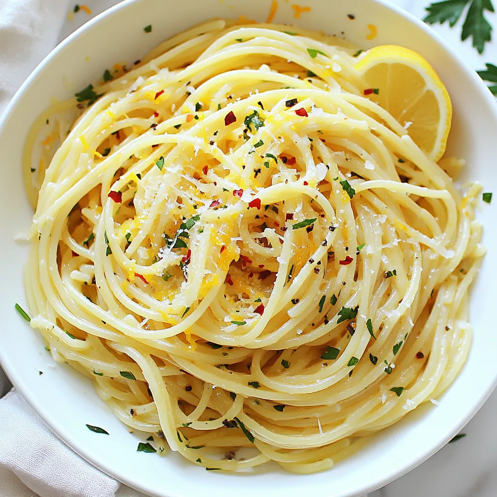 To make Spaghetti Aglio e Olio, gather these simple ingredients: - 400g spaghetti - 6 cloves garlic, thinly sliced - 1/2 cup extra virgin olive oil - 1 teaspoon red pepper flakes (adjust for heat) - 1/4 cup fresh parsley, finely chopped - Zest of 1 lemon - Juice of 1 lemon - Salt, to taste - Freshly shaved Parmesan cheese (optional) - Zest of 1 lime (optional) You can swap ingredients based on what you have: - Spaghetti: Use any pasta you like, such as fettuccine or linguine. - Garlic: If you hate garlic, try shallots or skip it altogether. - Olive oil: Use a light oil like canola if you want a milder taste. - Red pepper flakes: No spice? Omit them or use black pepper for flavor. - Parsley: Basil or arugula works as a fresh herb substitute. - Lemon: Lime juice or zest can add a nice twist. Using fresh ingredients makes a big difference. Fresh garlic gives a strong, rich flavor. Fresh herbs add brightness. Good-quality olive oil enhances the dish's overall taste. When you use fresh items, you create a dish that shines. It’s not just food; it’s an experience. Always choose the best ingredients you can find. This choice elevates your meal and impresses your guests. Trust me, fresh is always best! {{ingredient_image_2}} Start by filling a large pot with water. Add a good amount of salt. Bring the water to a rolling boil. Once boiling, add 400g of spaghetti. Cook it for about 8-10 minutes, or until it is al dente. Before you drain, save about 1 cup of the pasta water. This water helps later to mix everything well. Drain the spaghetti in a colander and set it aside. Next, take a large skillet and set it over medium heat. Pour in 1/2 cup of extra virgin olive oil. Add 6 cloves of thinly sliced garlic to the oil. Cook it gently for about 3-4 minutes. Stir it often. Watch the garlic closely. You want it to turn golden brown, not burnt. Burnt garlic will taste bitter and ruin your dish. Now, the fun part! Add the drained spaghetti to the skillet with the garlic oil. Toss the spaghetti gently. Make sure every strand gets coated with the garlic and oil. This step is key to flavor. To finish, sprinkle in the zest of 1 lemon and squeeze in the juice. Add 1/4 cup of finely chopped fresh parsley. Toss everything together. If the pasta looks dry, add some reserved pasta water, a few tablespoons at a time. This will give it a nice shine and moisture. Finally, taste the pasta. Add salt to your liking. Toss one last time. Serve it hot and enjoy! To cook spaghetti just right, start with a big pot of water. Add a good amount of salt. This helps flavor the pasta as it cooks. Bring the water to a rolling boil before adding your spaghetti. Cook it for about 8 to 10 minutes. You want it al dente, which means it should be firm to the bite. Before you drain it, save about one cup of the pasta water. This water helps make the sauce creamy later. Infusing flavor starts with the oil and garlic. Use high-quality extra virgin olive oil. Heat the oil in a skillet over medium heat. Add your sliced garlic and stir it often. Cook until the garlic is golden brown. Don’t let it burn, as burnt garlic tastes bitter. After that, add red pepper flakes. This adds a nice heat to the dish. Stir for about 30 seconds to let the flavors mix well. Fresh herbs and cheese can take your dish to the next level. After combining the spaghetti with the garlic oil, add lemon zest and juice. This gives a fresh taste. Then, toss in some chopped parsley for a herbal punch. For the final touch, sprinkle freshly shaved Parmesan cheese on top. This adds a rich, creamy flavor. You can also add lime zest for a fun twist. Enjoy the burst of flavors in each bite! Pro Tips Quality Olive Oil: Use a high-quality extra virgin olive oil for the best flavor. It makes a significant difference in this simple dish. Garlic Cooking Time: Be careful not to overcook the garlic. It should be golden and fragrant, not burnt, as burnt garlic can introduce bitterness. Adjusting Spice Level: Customize the heat by adjusting the amount of red pepper flakes. Start with less if you’re unsure, as you can always add more. Pasta Water Magic: The reserved pasta water is starchy and helps bind the sauce to the spaghetti. Add it gradually to achieve your desired sauce consistency. {{image_4}} You can easily add protein to your Spaghetti Aglio e Olio. Chicken and shrimp both work well. For chicken, grill or sauté pieces before adding them to the pasta. For shrimp, cook them in the garlic oil until pink. This adds flavor and makes the dish heartier. If you want a vegetarian take, consider adding seasonal veggies. Broccoli, spinach, or zucchini can fit nicely. Simply sauté the vegetables in the garlic oil before mixing in the spaghetti. This keeps the dish light and full of nutrients. Citrus adds a fresh twist to the dish. You can use lemon or lime zest to brighten the flavors. Just sprinkle it in when you toss the pasta. Nuts, like pine nuts or walnuts, can also bring a crunchy texture. Toast them lightly and mix them in for added depth. After enjoying your Spaghetti Aglio e Olio, you may have some leftovers. To keep them fresh, store the pasta in an airtight container. Make sure it cools to room temperature first. This helps prevent moisture build-up. Place the container in the fridge. The pasta stays good for up to three days. If you want to keep it longer, consider freezing it. When you're ready to eat leftovers, reheating is simple. You can use the microwave or a skillet. For the microwave, place the pasta in a bowl. Add a splash of olive oil or a bit of water. Cover it to keep moisture in. Heat for 1-2 minutes, stirring halfway. In a skillet, add the pasta over low heat. Stir gently and add a bit of oil to prevent sticking. Heat until warmed through. Freezing Spaghetti Aglio e Olio works well too. First, let the pasta cool completely. Then, place it in a freezer-safe bag or container. Try to remove as much air as possible to avoid freezer burn. Label the container with 