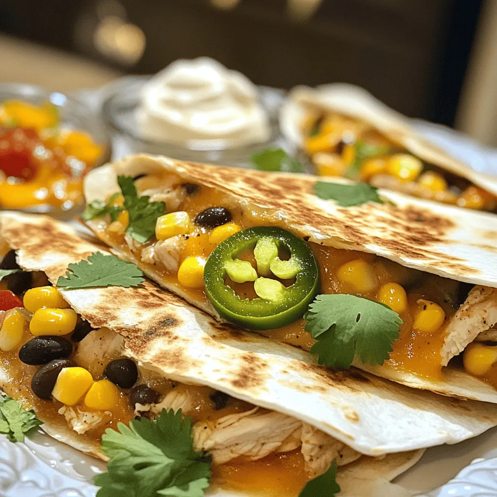 ![- 2 large chicken breasts, diced into bite-sized pieces - 1 tablespoon olive oil - 1 teaspoon taco seasoning - 1 teaspoon smoked paprika - 1 jalapeño, finely chopped - 1 cup corn kernels - 1 cup black beans - 1 cup shredded cheddar cheese - 1 cup shredded Monterey Jack cheese - 4 large flour tortillas - Salt and pepper, to taste - 1/4 cup fresh cilantro, chopped - Sour cream and salsa, for serving When I cook spicy chicken quesadillas, I focus on fresh and simple ingredients. The chicken breasts are the star here. I like to cut them into small pieces for quick cooking. This way, they soak up all the flavors from spices like taco seasoning and smoked paprika. Next, I add a jalapeño for heat, but you can remove the seeds for less spice. Corn and black beans add sweetness and texture. Together, they create a colorful filling. Cheese is crucial for that melty goodness. I mix cheddar and Monterey Jack for a creamy blend. Don’t forget the large flour tortillas; they wrap everything up nicely. Finally, I season with salt and pepper. Fresh cilantro is my go-to garnish. It brightens the dish. I serve these quesadillas with sour cream and salsa. These additions bring out the best flavors. For the full recipe, check the details above. - Heat olive oil in a large skillet. - Add diced chicken and season with taco seasoning and smoked paprika. - Cook until chicken is thoroughly cooked, about 7-10 minutes. In this step, make sure the skillet is hot enough. You want the chicken to sizzle when it hits the pan. The taco seasoning adds a great flavor. Smoked paprika gives a nice smoky touch. Stir the chicken often. This helps it cook evenly. You’ll know it’s ready when there’s no pink left. - Stir in chopped jalapeño, corn, and black beans. - Cook for an additional 2-3 minutes. Now, it’s time to boost the flavor. Adding jalapeños brings some heat. If you want it milder, remove the seeds. The corn adds sweetness, while black beans give protein. Mix everything well. Let them cook together for a few minutes. This melds the flavors nicely. - Place flour tortilla in a skillet and sprinkle with cheese. - Add chicken and vegetable mixture and fold. - Cook until golden brown on both sides. Grab a large skillet again. Place one tortilla in it and sprinkle half the cheese on top. Next, scoop some of the chicken and vegetable mix onto one half. Fold the tortilla over. This creates a pocket of goodness! Cook until the bottom is golden brown. Flip it carefully. Both sides should be crispy and brown. - Slice quesadillas into wedges. - Garnish with cilantro and serve with sour cream and salsa. Once cooked, take the quesadilla out. Let it cool for a minute. Then, slice it into wedges. This makes dipping easy. Sprinkle fresh cilantro on top for a burst of flavor. Serve with sour cream and salsa on the side. These add a creamy and tangy element to your dish. For the full recipe, check out the details above! - Ensure chicken is thoroughly cooked to avoid any raw texture. - Use a non-stick skillet for easier flipping. When cooking chicken, make sure it reaches an internal temperature of 165°F. This keeps it safe and tasty. I often check by cutting a piece in half to see if it's no longer pink. A non-stick skillet helps prevent the quesadillas from sticking. This way, flipping them becomes a breeze. - Experiment with different cheeses for added flavor. - Adjust jalapeño amount based on spice preference. Trying different cheeses can change the whole dish. You might love a mix of pepper jack and cheddar for a spicy kick! If you like it mild, reduce the jalapeño. On the other hand, if you crave heat, toss in more. Every bite should be just right for you. - Pair with Mexican rice or a fresh salad. - Serve with lime wedges for a citrusy twist. I love serving these quesadillas with Mexican rice. It adds a nice touch and makes the meal more filling. A fresh salad with crunchy veggies offers a great contrast. Don’t forget lime wedges! A squeeze of lime adds a bright flavor that complements the spices perfectly. For the full recipe, check out the section above. {{image_4}} You can make spicy chicken quesadillas vegetarian by swapping chicken for grilled vegetables or tofu. Try using bell peppers, zucchini, or mushrooms. These veggies will soak up the spices and add great taste. Tofu gives a nice texture and protein. Just make sure to season them well with taco seasoning. If you prefer other meats, use beef or shrimp instead of chicken. Both will bring their own unique flavors. For beef, consider using ground beef or steak strips. For shrimp, use peeled and deveined shrimp. Explore different marinades for varied flavors. A spicy marinade can add excitement to your filling! Cheese is key in quesadillas. You can try pepper jack cheese for some extra heat. Its creamy texture matches well with the spicy filling. Goat cheese is another option for a creamy twist. It melts nicely and adds a tangy flavor. Mixing different cheeses can create a rich, delicious taste! For the full recipe, check out the [Full Recipe]. Store any leftover quesadillas in an airtight container. They will last in the fridge for up to 3 days. This way, you can enjoy them again and save time on cooking. You can freeze uncooked quesadillas for later use. Just prepare them as you normally would, but do not cook them. Wrap each quesadilla tightly in plastic wrap. Cooked quesadillas can also be frozen for up to one month. This is a great way to have a quick meal ready. To reheat, use a skillet for the best texture. Heat the skillet over medium heat and add the quesadilla. Cook until heated through and crispy. If you need a quick option, a microwave works too. Just place the quesadilla on a plate, cover it with a paper towel, and heat for about 30 seconds to 1 minute. Enjoy your tasty meal! You can use beans or grilled vegetables as a filling. Black beans work well. They add protein and fiber. Grilled peppers or zucchini also give a great taste. This optio