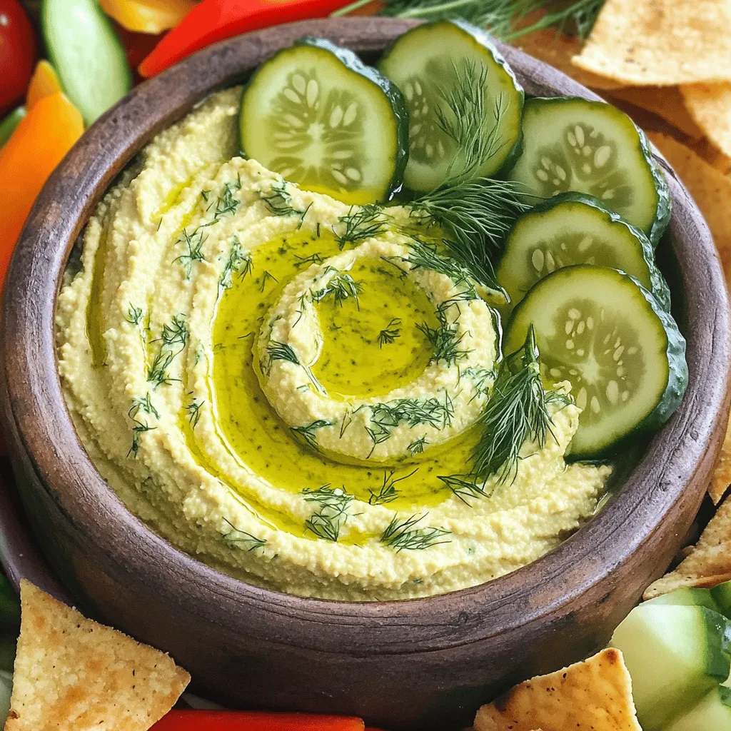 Once you are happy with your hummus, carefully transfer it to a serving bowl. To make it look pretty, drizzle some olive oil on top. Then, sprinkle fresh dill over the surface. You can also add sliced dill pickles around the edge for a fun touch.