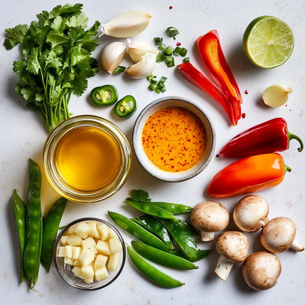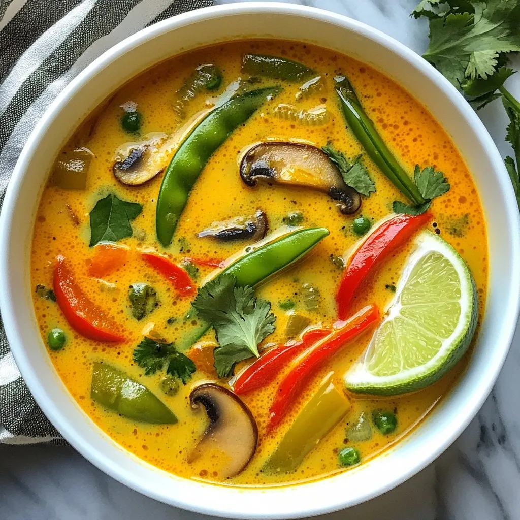 To create this tasty Spicy Thai Coconut Curry Soup, you will need: - 1 tablespoon coconut oil - 1 medium onion, diced - 3 cloves garlic, minced - 1 tablespoon fresh ginger, finely grated - 2 tablespoons red curry paste - 1 can (400ml) coconut milk - 4 cups vegetable broth - 1 cup bell peppers, sliced (red, yellow, or green) - 1 cup snap peas, trimmed - 1 cup mushrooms, sliced (shiitake or button) - 1 tablespoon soy sauce or tamari (gluten-free option) - 1 tablespoon fresh lime juice - Fresh basil leaves and cilantro sprigs for garnish - Salt to taste - Chili flakes (optional) Using fresh ingredients makes your soup vibrant and full of flavor. Fresh garlic and ginger add a strong aroma and taste. Fresh herbs like basil and cilantro give a bright finish. Dried ingredients, like curry paste, offer convenience and longer shelf life. You can use dried herbs in a pinch, but fresh always shines. If you lack any ingredients, don't worry! Here are some swaps: - Coconut oil can be replaced with olive oil or butter. - Any onion type works, though yellow onion is best for flavor. - If you don’t have fresh ginger, use 1 teaspoon of ground ginger instead. - Red curry paste can be swapped with green curry paste for a different taste. - Vegetable broth can be replaced with chicken broth for non-vegetarians. - For mushrooms, use any type you like, such as portobello or cremini. - Lime juice can be swapped with lemon juice for a similar tang. Feel free to get creative! This soup is forgiving and adapts well to your tastes. {{ingredient_image_2}} 1. Start by gathering all your ingredients. This helps keep your cooking smooth. 2. Dice the onion, mince the garlic, and grate the ginger. Set them aside. 3. Slice the bell peppers and mushrooms. Trim the snap peas. These add color and texture. 4. Measure out the coconut milk, broth, and other liquids. This saves time later. 1. In a large pot, heat 1 tablespoon of coconut oil over medium heat. Wait until it shimmers. 2. Add the diced onion and sauté for about 5 minutes. Stir until the onion is clear. 3. Mix in the minced garlic and grated ginger. Sauté for 1 minute until fragrant. 4. Stir in 2 tablespoons of red curry paste. Cook it for 2-3 minutes to blend the flavors. 5. Pour in 1 can of coconut milk and 4 cups of vegetable broth. Stir well to mix everything. 6. Bring the mixture to a gentle simmer. This allows the flavors to mingle. 7. Add the sliced bell peppers, snap peas, and mushrooms. Let it simmer for 10-15 minutes. 8. When the veggies are tender, stir in 1 tablespoon of soy sauce or tamari. 9. Add 1 tablespoon of fresh lime juice and salt to taste. If you like heat, sprinkle chili flakes. 1. Ladle the soup into deep bowls. This makes for a hearty serving. 2. Top with fresh basil leaves and cilantro sprigs. They add a burst of flavor. 3. Serve hot, and consider adding a slice of lime on the side. This adds extra zest! To boost the flavor of your Spicy Thai Coconut Curry Soup, use fresh herbs. Fresh basil and cilantro add a bright touch. You can also add lime zest for extra zing. Another trick is to toast the red curry paste. Heat it in the coconut oil for a minute before adding other ingredients. This brings out more flavor. If you want more heat, add chili flakes or fresh chilies. Start with a little and taste as you go. If the soup becomes too spicy, add more coconut milk to cool it down. A dollop of yogurt can also help tame the heat. Balance is key, so find what works best for you! One common mistake is overcooking the veggies. Make sure they stay crisp and colorful. Another error is not tasting as you cook. Always check the seasoning and adjust it. Lastly, don’t skip the lime juice. It brightens the dish and ties all the flavors together. Enjoy cooking! Pro Tips Use Fresh Ingredients: Fresh vegetables and herbs enhance the flavor and nutrition of your soup. Opt for seasonal produce whenever possible. Adjust the Spice Level: If you prefer a milder soup, start with less red curry paste and gradually add more to taste. You can always add more heat, but it's tough to tone it down! Make it a Meal: For a heartier version, consider adding protein such as tofu, chicken, or shrimp. Just adjust cooking times accordingly to ensure everything is cooked through. Storage Tips: This soup can be stored in the refrigerator for up to 3 days. For longer storage, freeze in airtight containers and reheat as needed. {{image_4}} You can easily make this soup vegan. Use vegetable broth and coconut milk, which are already vegan-friendly. Skip the soy sauce if you want to avoid gluten, or use gluten-free tamari. You can also add more veggies like carrots or zucchini. They add great flavor and nutrients. If you want protein, add tofu or chicken. For tofu, use firm or extra-firm. Cut it into cubes and sauté it until golden before adding it to the soup. If you prefer chicken, use bite-sized pieces. Cook the chicken in the pot after the onions. This will keep it juicy and tender. Feel free to mix and match your favorite veggies. Use bok choy, spinach, or even corn. Just make sure to add them at the right time. Quick-cooking veggies, like spinach, should go in near the end. This way, they stay bright and fresh. Enjoy experimenting with different flavors and textures! To keep your Spicy Thai Coconut Curry Soup fresh, store it in an airtight container. Let the soup cool to room temperature before sealing it. This helps avoid condensation that can make the soup watery. You can keep it in the fridge for about 3 to 4 days. Always label the container with the date to track freshness. For longer storage, you can freeze the soup. Use freezer-safe containers or bags and leave some space for expansion. The soup can last up to 3 months in the freezer. When you’re ready to eat it, thaw it in the fridge overnight. Reheating your soup is simple. You can use a pot on the stove over low heat, stirring often. If you're in a hurry, a microwave works well too. Heat it in short bursts, stir
