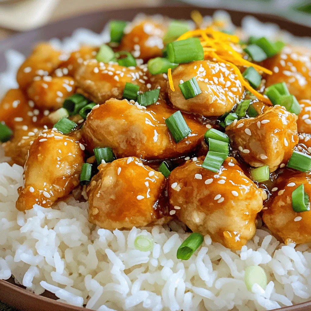 ![To make sticky orange chicken, you'll need a few simple yet flavorful items. Here is a complete list of ingredients you'll need for this recipe: - 1.5 lbs boneless, skinless chicken thighs - 1/2 cup cornstarch - 2 tablespoons vegetable oil - 3 cloves garlic, finely minced - 1-inch piece of fresh ginger, grated - 1/4 cup low sodium soy sauce - 1/2 cup freshly squeezed orange juice - Zest of 1 medium orange - 1/4 cup honey - 2 tablespoons rice vinegar - 1/2 teaspoon red pepper flakes (optional) - 2 green onions, finely chopped, for garnish - Sesame seeds, for garnish Using high-quality chicken is key for this dish. Chicken thighs stay juicy and tender. Cornstarch is essential for a crispy texture. Vegetable oil helps with frying and flavor. Fresh garlic and ginger bring bold taste to the sauce. Orange juice and zest create a bright, zesty flavor. Honey adds sweetness that balances the dish. Rice vinegar gives a touch of tang. If you like spice, add red pepper flakes for heat. Don’t forget the green onions and sesame seeds for garnish. They add color and crunch. This recipe is simple yet packed with flavor. You can find the full recipe in earlier sections. Coating with Cornstarch Start by placing the chicken pieces in a big bowl. Pour in the cornstarch. Mix it well with your hands or a spoon. Make sure all chicken pieces are covered. This step is key for a crispy finish. Sautéing the Chicken Pieces Next, heat the vegetable oil in a large skillet or wok on medium-high heat. Once hot, add the chicken in batches. Avoid crowding the pan. Cook for about 5-7 minutes. Stir it often until the chicken turns golden brown. Check that each piece reaches 165°F inside. Remove the chicken and place it on a plate with paper towels to soak up extra oil. Sautéing Garlic and Ginger Lower the heat to medium. In the same skillet, add the minced garlic and grated ginger. Sauté for about 30 seconds. You want to smell the rich aroma of garlic and ginger. This signals it’s time to mix the sauce. Mixing the Sauce Ingredients Pour in the soy sauce, orange juice, orange zest, honey, and rice vinegar. If you like some heat, add the red pepper flakes. Stir it all together. Increase the heat slightly and let it bubble. Allow the sauce to simmer for 3-5 minutes. You want it to thicken and develop a rich flavor. Glazing the Chicken Now, return the cooked chicken to the skillet. Use a spatula to toss the chicken in the sauce. Ensure every piece gets coated. Let it cook for another 2-3 minutes. This will heat the chicken through and make it sticky and flavorful. Garnishing for Serving Take the skillet off the heat. Sprinkle the chopped green onions and sesame seeds over the chicken. These add color and crunch. Serve this dish hot and enjoy the zesty flavors of your sticky orange chicken. Check the Full Recipe for more details! Importance of Cornstarch Coating Coating the chicken in cornstarch is key for a crispy bite. It helps create a crunchy layer when you fry it. The cornstarch seals in moisture, keeping the chicken juicy. You want to ensure every piece is coated well. This simple step makes a big difference in texture and taste. Avoiding Overcrowding the Pan Do not overcrowd the pan when cooking the chicken. If you add too much at once, the chicken will steam instead of fry. This means less crispiness. Cook in batches and give each piece space. This way, you get that golden-brown color you want. Using Fresh Ingredients Using fresh ingredients makes your dish taste better. Fresh garlic and ginger give a bright flavor. Squeeze your own orange juice for the best taste. Fresh zest adds a lovely aroma. These small details make your sticky orange chicken shine. Adjusting Spice Levels If you like heat, add red pepper flakes. Start with a small amount and taste as you go. You can always add more if you want a kick. If you prefer a milder dish, skip the spice. Tailor the recipe to your taste buds. Pairing with Sides This sticky orange chicken goes well with many sides. Serve it over fluffy jasmine rice for a complete meal. Steamed broccoli or green beans also work nicely. These sides balance the sweetness of the chicken. Presentation Ideas Make your dish look as good as it tastes. Use a white plate to make the orange color pop. Drizzle some extra sauce on top. Sprinkle sesame seeds and green onions for a final touch. A pretty plate makes every meal special. For the full recipe, check out the Sticky Orange Chicken Delight. {{image_4}} You can easily switch up the protein in this dish. - Using Chicken Breasts: You can replace chicken thighs with chicken breasts. They are leaner and will still taste great. Just be sure to cook them until they are juicy. - Substituting with Tofu or Tempeh: For a plant-based option, try tofu or tempeh. Cut them into bite-sized pieces and follow the same steps as the chicken. They soak up the sauce well and give a nice texture. Feel free to play with flavors to make this dish your own. - Adding More Citrus: Want more zing? Add lime or lemon juice. A splash at the end brightens the dish and gives it a fresh twist. - Experimenting with Herbs and Spices: You can also try adding fresh herbs like cilantro or basil. A sprinkle of these can add depth and freshness. This recipe can fit many dietary needs. - Gluten-Free Modifications: If you're gluten-free, use tamari instead of soy sauce. This keeps the flavor while making it safe for your diet. - Low-Sugar Alternatives: For a low-sugar version, substitute honey with a sugar-free sweetener. This still gives sweetness without the extra calories. These variations help you enjoy Sticky Orange Chicken in your own way. Check the Full Recipe for more details! After you enjoy your sticky orange chicken, you may have some leftovers. To keep them fresh, store the chicken in an airtight container. Place it in the fridge. It will last for about 3 to 4 days. When reheating, use the microwave or a skillet. Heat it gently to avoid drying it out. A splash of water 