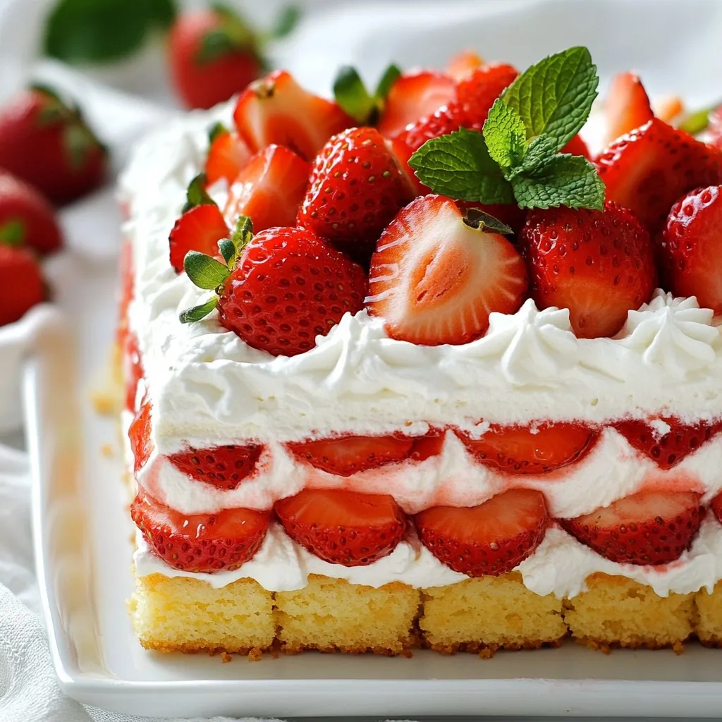 Each ingredient plays a key role in making this cake delightful. Fresh strawberries bring sweetness and color. Granulated sugar helps draw out the juice from the strawberries, creating a tasty syrup. Heavy whipping cream forms the fluffy whipped topping, while powdered sugar adds just the right sweetness.