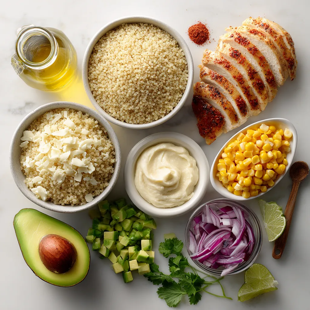 The base of this Street Corn Chicken Bowl starts with cooked quinoa. Quinoa is a great grain. It adds protein and fiber. You need two cups for this dish. Next, you will need one pound of grilled chicken. The chicken should be sliced. This adds heartiness to your bowl.