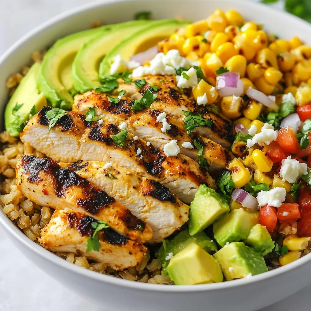 - Assemble the Bowls: Start by layering the bottom of each serving bowl with the cooked brown rice. On top of the rice, artfully arrange the grilled chicken slices, charred corn, diced red bell pepper, avocado, and finely chopped red onion.