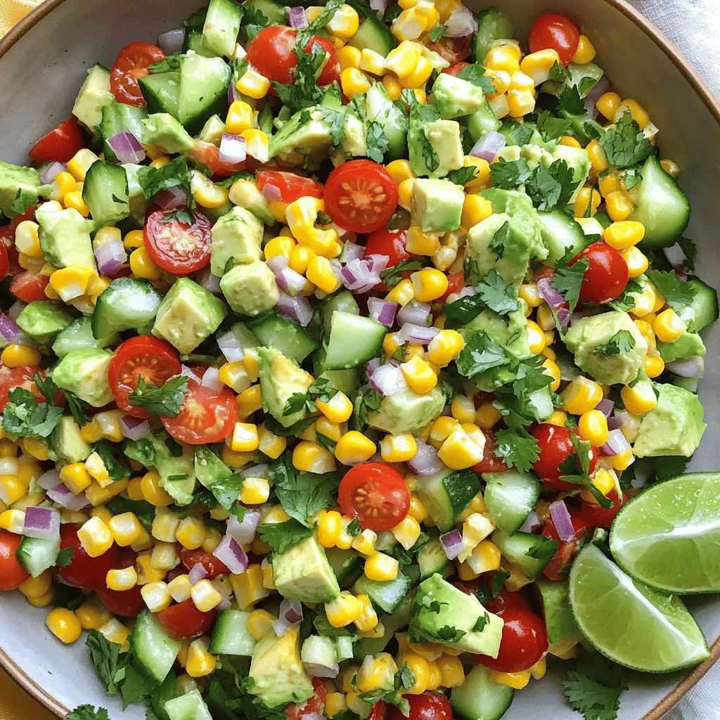 To make a bright and tasty summer corn salad, gather these fresh ingredients: - 4 cups fresh corn kernels (approximately 6 ears of corn) - 1 red bell pepper, diced into small pieces - 1 cucumber, diced into small cubes - ½ red onion, finely chopped - 1 cup cherry tomatoes, halved - 1 ripe avocado, diced into bite-sized pieces - ½ cup fresh cilantro, chopped coarsely - 3 tablespoons freshly squeezed lime juice - 2 tablespoons extra virgin olive oil - 1 teaspoon honey (optional, for a touch of sweetness) - Salt and freshly cracked black pepper, to taste Choosing the best corn is key for a great salad. Here are some tips: - Look for bright green husks. They should be moist and tight. - Check the silk. It should be brown and sticky, not dry. - Feel the kernels. Press on the cob. It should feel plump and firm. - Choose small to medium ears. They tend to be sweeter than large ones. You can customize your summer corn salad with these options: - Beans: Black beans or chickpeas add protein. - Feta cheese: Crumbled feta brings a salty flavor. - Spices: Add chili powder for some heat. - Other veggies: Try zucchini or radishes for crunch. Feel free to mix and match these ingredients to make the salad your own. You can find the Full Recipe for more guidance on how to prepare this refreshing dish! To start, shuck the corn. Remove the husks and silk from each ear. Next, hold the corn upright in a bowl. Use a sharp knife to cut down the sides of the cob. You want to release the kernels into the bowl. This method helps catch any kernels that fall. Aim for about four cups of fresh corn. In a large mixing bowl, add the corn kernels you just cut. Then, dice the red bell pepper and cucumber into small pieces. Finely chop the red onion and halve the cherry tomatoes. Toss all these colorful veggies into the bowl. Mix them gently so they combine well. Finally, fold in the diced avocado and chopped cilantro. Be careful not to mash the avocado. Grab a small bowl to make the dressing. Whisk together three tablespoons of lime juice and two tablespoons of olive oil. If you like a hint of sweetness, add one teaspoon of honey. Season the dressing with salt and cracked black pepper to taste. Once mixed, drizzle it over the salad. Use a spatula to toss the salad gently. Make sure every bite gets some of that zesty dressing. Let the salad sit for ten minutes to let the flavors blend. For the full recipe, refer to the earlier section. Enjoy making this simple and refreshing summer corn salad! To make your salad shine, focus on the ingredients. Fresh corn is sweet and crunchy, so let it be the star. The lime juice adds a zesty kick, while olive oil brings a smooth finish. If you want more sweetness, a teaspoon of honey can really help. Salt and pepper enhance all the flavors. Always taste your salad before serving. Adjust the seasoning as needed. Sometimes, a little extra lime juice makes a big difference. This salad is perfect for summer picnics or family gatherings. It pairs well with grilled chicken or fish. You can also serve it as a side dish for tacos or BBQ. If you want to add protein, consider black beans or grilled shrimp. You might even enjoy it on top of nachos for a fun twist. For a refreshing drink, try serving it with iced tea or lemonade. A great presentation makes food more inviting. Serve the salad in a large, shallow bowl. This shows off the vibrant colors of the veggies. You can also use individual mason jars for a fun touch. Each jar becomes a mini serving that’s easy to grab. Garnish with extra cilantro on top for a fresh look. Adding lime wedges on the side brightens up the dish. These small details can make a big impact at your table. For the full recipe, check the earlier section! {{image_4}} You can change up the corn salad easily. Try adding diced zucchini for a nice crunch. You can also use grated carrots for a hint of sweetness. Chopped radishes add a peppery bite. For a colorful twist, add yellow bell pepper or diced green onions. Even a handful of spinach can boost the nutrients. While lime and olive oil taste great, you can mix it up. Use apple cider vinegar for a tangy kick. A splash of balsamic vinegar brings a rich flavor. For a creamy option, add Greek yogurt or sour cream. You can also try a honey mustard dressing for a sweet and tangy twist. To add heat, toss in some chopped jalapeños or a pinch of cayenne pepper. If you prefer sweet, add diced mango or pineapple. A drizzle of agave syrup can also enhance sweetness without being overpowering. Adjust these additions to suit your taste for a perfect summer dish. After enjoying your summer corn salad, store any leftovers in an airtight container. This keeps the flavors fresh. Place the salad in the fridge. It should stay good for about three days. If you notice any browning on the avocado, remove that part before serving again. If you have extra corn, freezing is a great option. Start by blanching the corn kernels in boiling water for two minutes. This locks in the flavor and color. After blanching, cool the corn in ice water. Drain and dry the kernels, then pack them in freezer bags. Remove as much air as you can. Frozen corn can last up to a year, making it a handy ingredient for future salads. Most ingredients in this salad have a good shelf life: - Fresh corn: Use within 3-5 days for the best taste. - Red bell pepper: Lasts about a week in the fridge. - Cucumber: Stays fresh for about a week too. - Red onion: Can last for a couple of weeks if stored in a cool place. - Cherry tomatoes: Best within a week for optimal flavor. - Avocado: Ripens quickly, so use it within a few days of buying. - Cilantro: Good for about a week if kept in water like a bouquet. Keeping track of these times helps you enjoy your summer corn salad at its best! For the full recipe, check the earlier sections. Yes, you can use canned corn. It is quick and easy. Choose corn with no added sugar or salt. Drain and rinse the corn before adding it to the salad. Thi