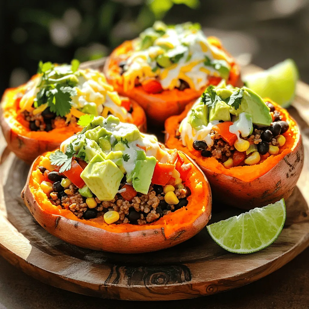 ![- 4 medium sweet potatoes - 1 lb ground turkey (or beef) - 1 tablespoon olive oil - 1 can (15 oz) black beans, rinsed and drained - 1 cup corn kernels (fresh or frozen) - 1 packet taco seasoning - 1 cup diced tomatoes (fresh or canned) - 1 cup shredded cheddar cheese - 1 avocado, diced - 1/4 cup fresh cilantro, chopped - 1 lime, cut into wedges - Salt and pepper to taste - Sour cream - Jalapeños - Salsa Gathering these ingredients is simple, and it sets the stage for a tasty meal. The sweet potatoes bring a nice sweetness and a lot of nutrients. Ground turkey or beef gives a hearty flavor. The black beans, corn, and tomatoes add texture and nutrition. Taco seasoning brings the classic flavor that everyone loves. The cheese and avocado on top make it all even better. Don't forget the lime for a fresh kick! For a full recipe, check out the [Full Recipe]. - Preheat the oven to 425°F (220°C). - Scrub and poke holes in sweet potatoes. - Bake sweet potatoes for 45-50 minutes. First, I preheat my oven to 425°F (220°C). This step is key to getting those sweet potatoes nice and tender. Next, I scrub each sweet potato under running water. Then, I poke holes in them with a fork. This prevents them from bursting while baking. After that, I place the potatoes on a baking sheet lined with parchment paper. Finally, I bake them for 45-50 minutes until they are soft. - Heat olive oil in a skillet over medium heat. - Cook ground turkey (or beef) until browned. - Stir in taco seasoning, black beans, corn, and tomatoes; simmer for 5-7 minutes. While the potatoes bake, I heat a tablespoon of olive oil in a skillet over medium heat. I add 1 pound of ground turkey or beef. I cook it until it is browned, about 5-7 minutes. Then, I stir in the taco seasoning, a can of rinsed black beans, corn, and diced tomatoes. I let this simmer for another 5-7 minutes. This lets all the flavors mix together nicely. - Slice baked sweet potatoes in half lengthwise. - Scoop filling into each half and top with cheese. - Garnish with avocado and cilantro, serve with lime wedges. Once the sweet potatoes are soft, I carefully take them out of the oven. I slice each potato in half lengthwise, making a boat shape. Then, I scoop the taco filling generously into each half. I sprinkle shredded cheddar cheese on top, letting it melt slightly from the heat. Finally, I garnish with diced avocado and fresh cilantro. I serve them with lime wedges on the side. A squeeze of lime adds a perfect tang to this dish. For the full recipe, check out the details above. - Adjust taco seasoning to taste. You can add more for a bolder flavor. - Incorporate lime juice for extra zing. This brightens the dish and adds freshness. - Use a fork to check for doneness easily. Poke the sweet potatoes to see if they are soft. - Allow cooling before cutting to prevent burns. Sweet potatoes hold heat well, so be careful. - Arrange on a platter for visual appeal. A colorful display makes the meal more inviting. - Drizzle lime juice for an added touch. This adds flavor and makes the dish shine. I love using these tips to make Taco Stuffed Sweet Potatoes even better. If you want to try this recipe, check out the Full Recipe for all the details. {{image_4}} You can switch up the protein in your taco stuffed sweet potatoes. Ground beef or chicken works great. If you want to keep it plant-based, try using lentils or beans. Shredded pork can also give a fun twist to the dish. Each option brings a unique taste and texture. Don't forget to add extra veggies! Diced bell peppers or onions can add flavor and crunch. You can also toss in spinach or kale for more nutrition. Adding these veggies not only boosts the health factor but also brightens the dish's colors. Want to mix things up a bit? Try some Mexican-style toppings like pico de gallo. This fresh salsa adds a burst of flavor. You can also use Greek yogurt instead of sour cream. It gives a creamy texture with less fat, making it a healthier choice. These simple changes can make your meal even more exciting. Store any leftovers in an airtight container. They stay fresh for up to 3 days. To keep the quality high, keep your toppings separate. This will help prevent sogginess and keep flavors bright. For quick reheating, use the microwave. Heat in short bursts to avoid hot spots. If you want a crispy texture, use the oven instead. Preheat it to 350°F and heat for about 10-15 minutes. You can freeze cooked sweet potatoes and the filling separately. This helps maintain their texture. When you're ready to eat, thaw everything in the fridge overnight. Then, reheat as needed for a tasty meal. - Approximately 45-50 minutes at 425°F. Sweet potatoes need time to bake until they are soft. You want them tender, so they are easy to scoop. I usually check them after 45 minutes. If they are not done, I leave them for a few more minutes. You can poke them with a fork to check. - Yes, prepare everything in advance and assemble before serving. Making these stuffed potatoes ahead of time is a great idea. You can bake the sweet potatoes and cook the taco filling. Store them separately in the fridge. When you are ready to eat, just warm them up and stuff the sweet potatoes. It saves time and keeps things simple. - Rich in vitamins A and C, fiber, and antioxidants. Sweet potatoes are a superfood. They are full of vitamins that help your body. Vitamin A is good for your eyes, and vitamin C helps your immune system. The fiber in sweet potatoes also helps with digestion. Plus, they have antioxidants that fight free radicals. - Yes, but sweet potatoes provide a unique flavor and nutrition. You can use regular potatoes if you want. They will work fine. However, sweet potatoes give a nice, sweet taste. They also have more nutrients than regular potatoes. So, I recommend sticking with sweet potatoes for this recipe. - A side salad or additional toppings like guacamole or corn chips. These stuffed potatoes are filling on their own. However, a si