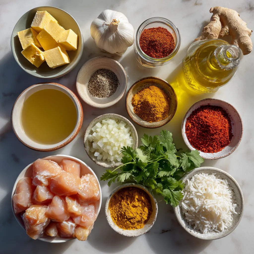 In this recipe, chicken thighs lend a juicy texture. Butter and olive oil create a rich base. Onions, garlic, and ginger add amazing flavor. Paprika, cumin, turmeric, and chili powder bring warmth and spice. Heavy cream and chicken broth create a creamy sauce. Salt and pepper enhance every bite.